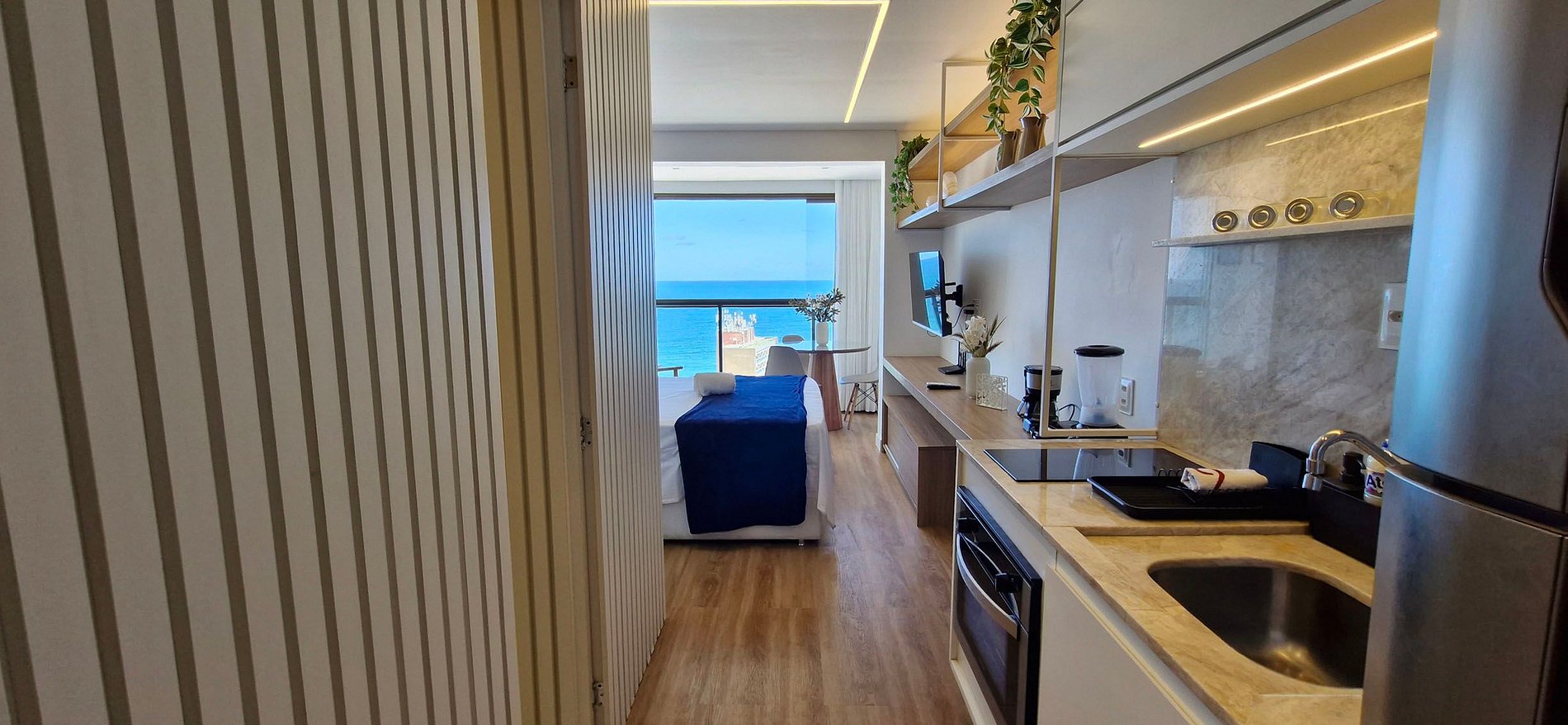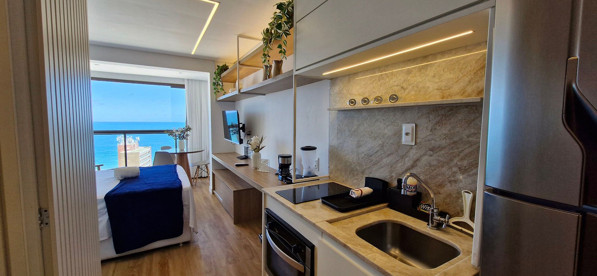 Muy cerca del shopping Barra y del Carnaval Barra-Ondina. Con cama queen, smart TV con antena local, WI-FI, aire acondicionado split y cocina. Terraza con piscina, gimnasio, garaje y recepción 24 horas. Sala de juegos, coworking, sala de reuniones. Lavandería de pago y minimercado.