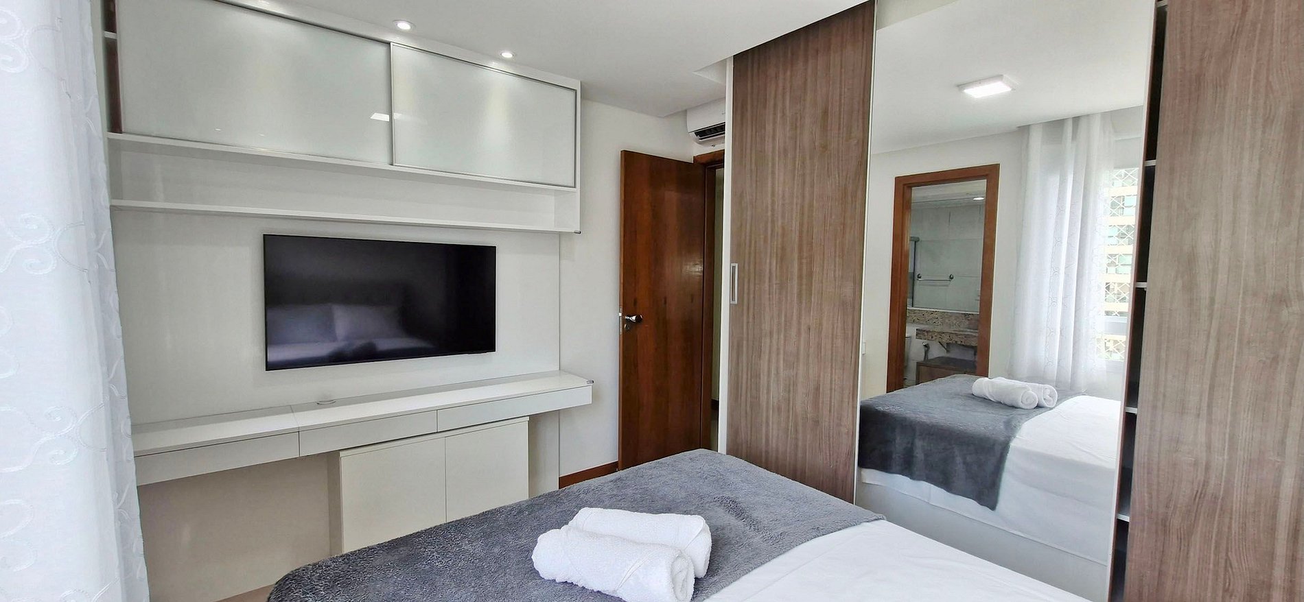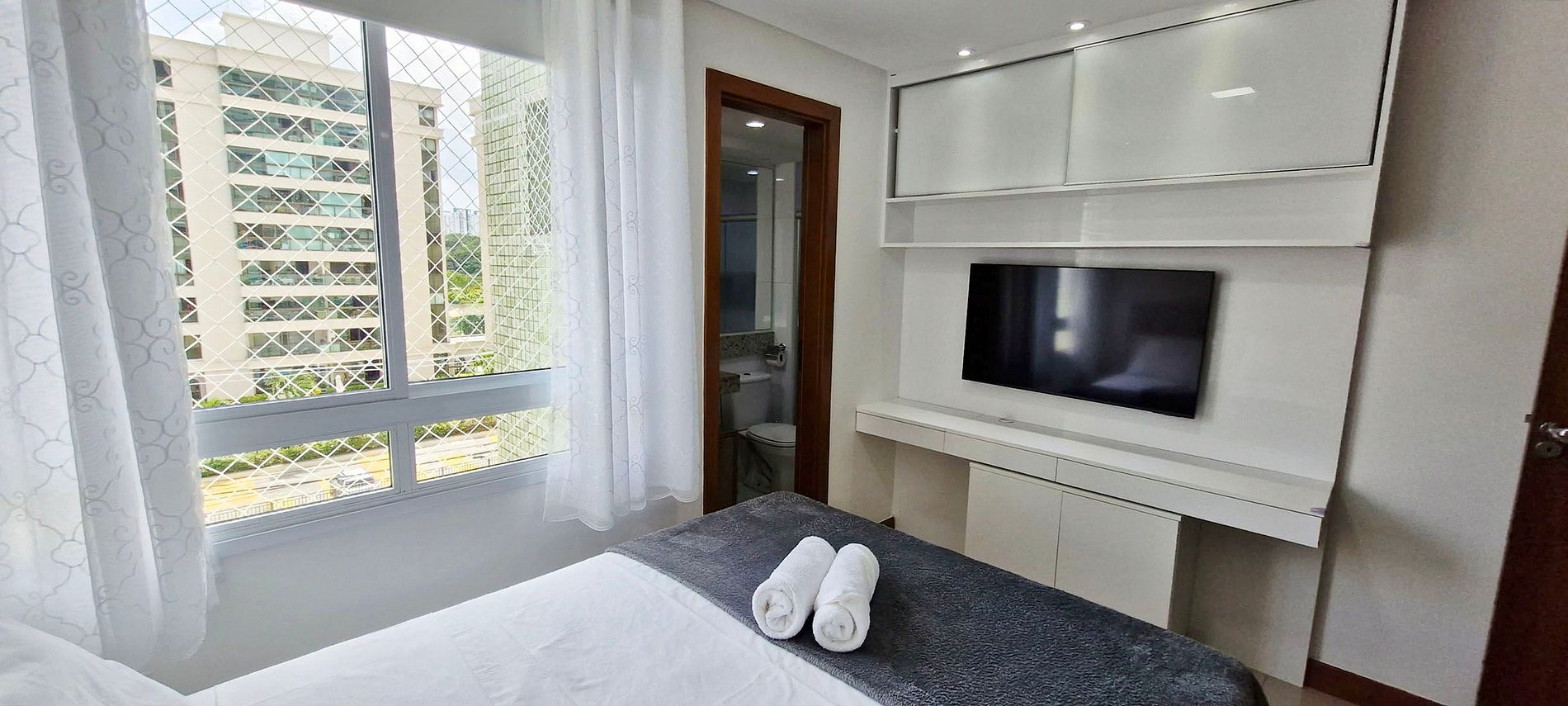 - SUITE: Cama doble, armario con espejo grande, red de seguridad, mueble de TV con mesa, lámpara de noche, Smart TV UHD 4K de 43", aire acondicionado split, cortinas opacas. BAÑO: Armario, espejo, cabina de ducha, bidé, ducha de gas.
