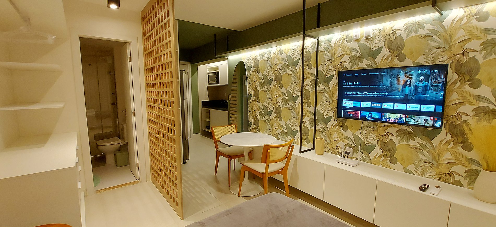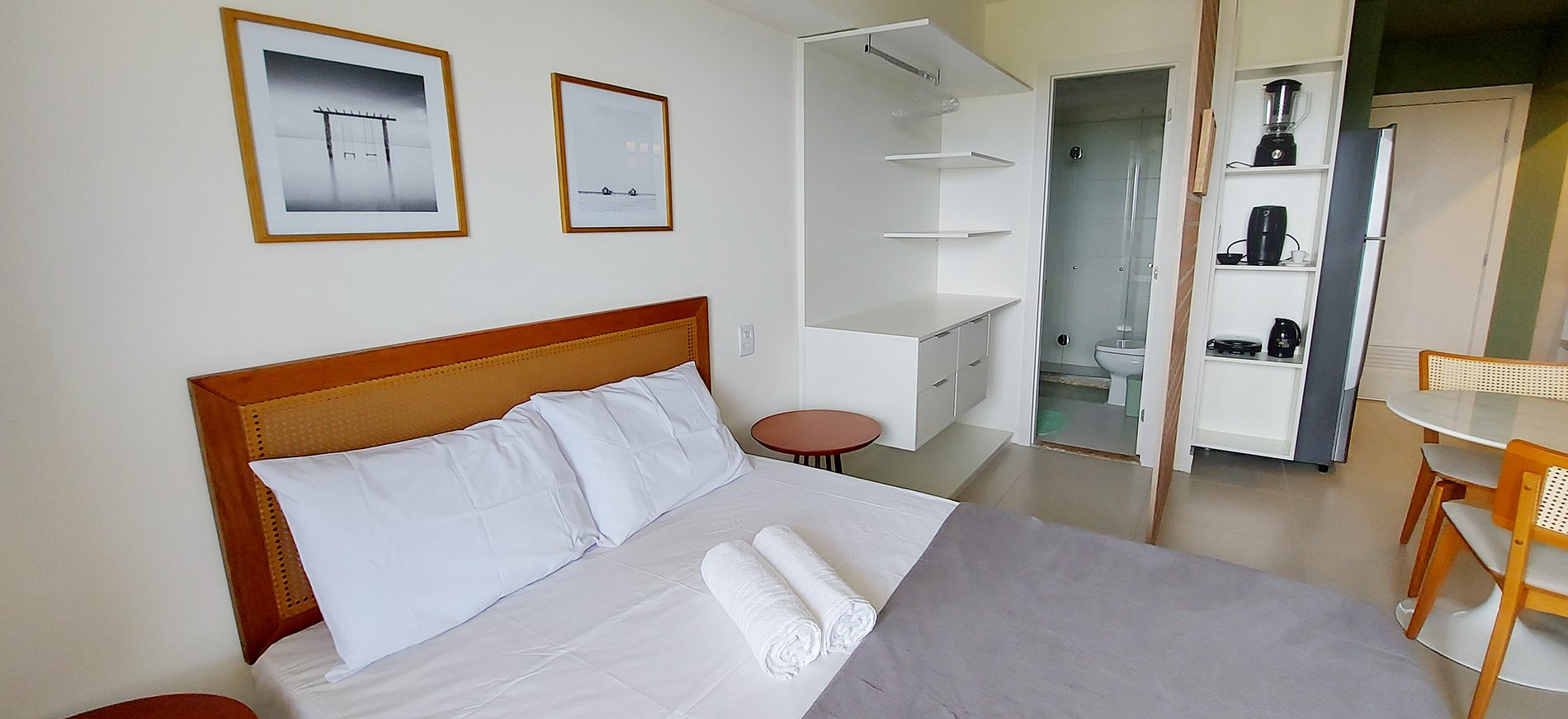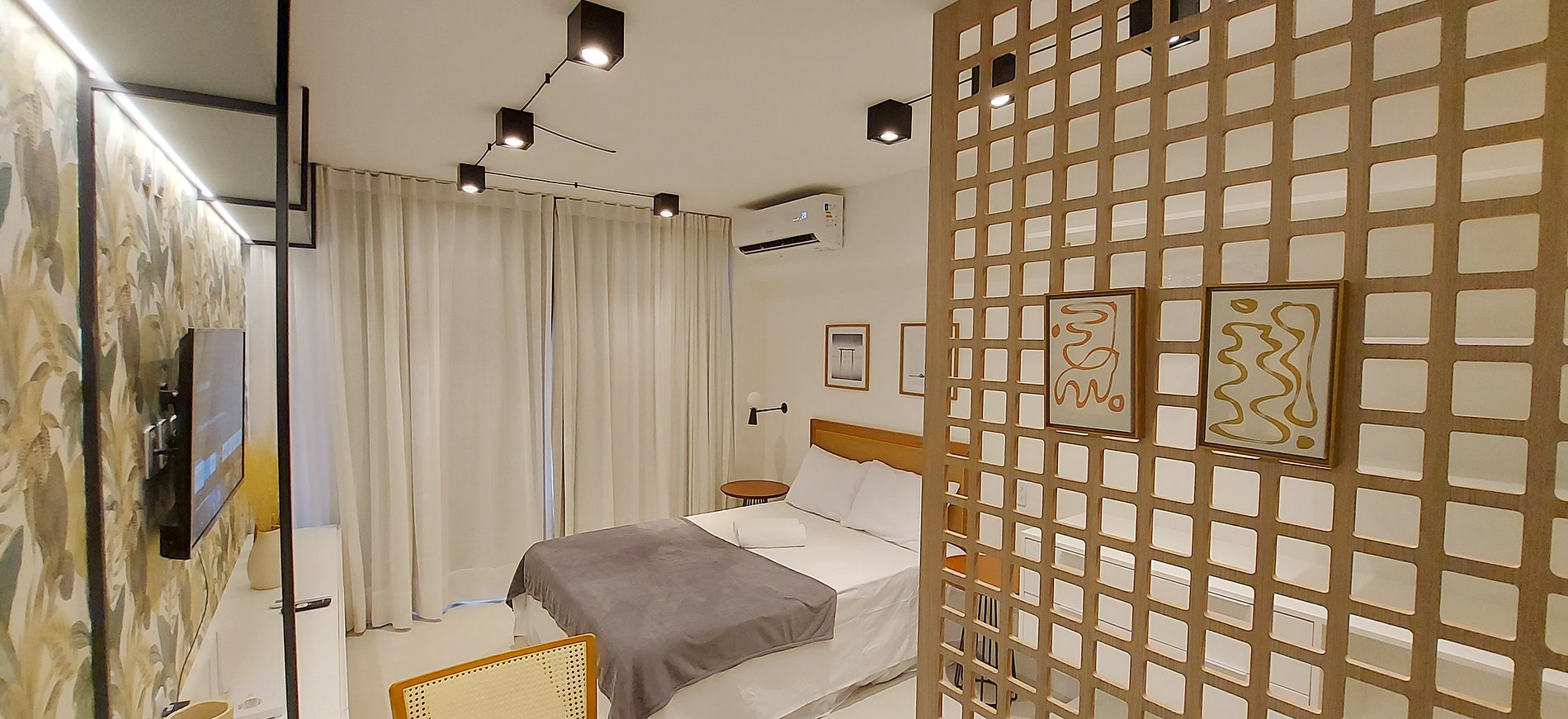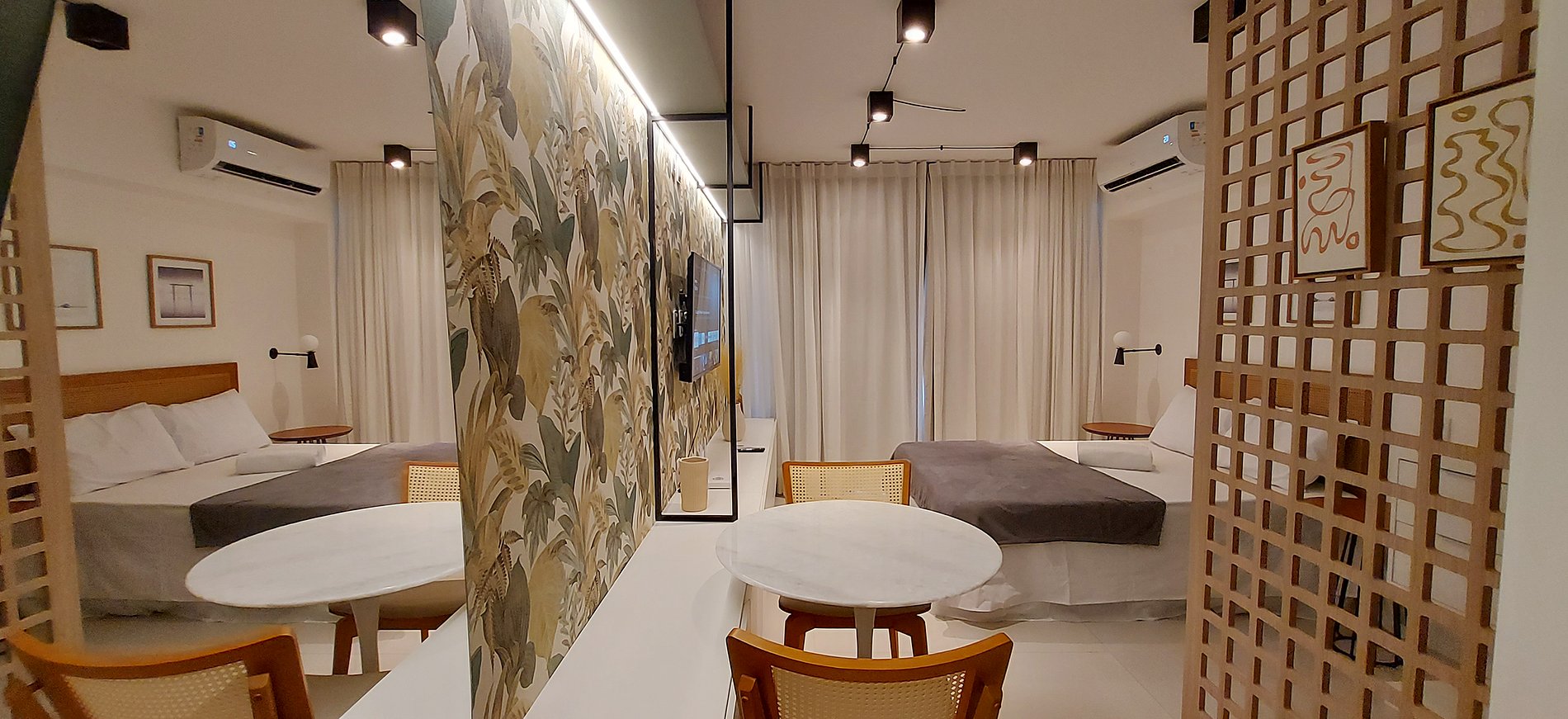 - Espacio con cama matrimonial, armario, 2 mesitas de noche redondas, aire acondicionado split, ventana con cortina blackout, estante de madera con smart TV, mesa redonda con sillas para 2 personas