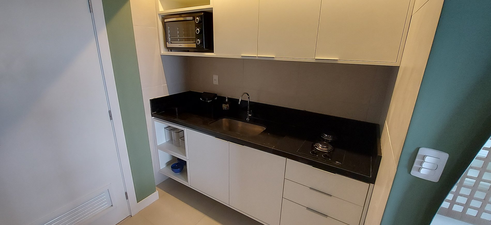 - Cocina con licuadora, sandwichera, cafetera de cápsulas (trae tu cápsula - marca de 3 corazones), refrigerador duplex, termo, anafe de 2 fuegos, horno eléctrico, varios accesorios de cocina