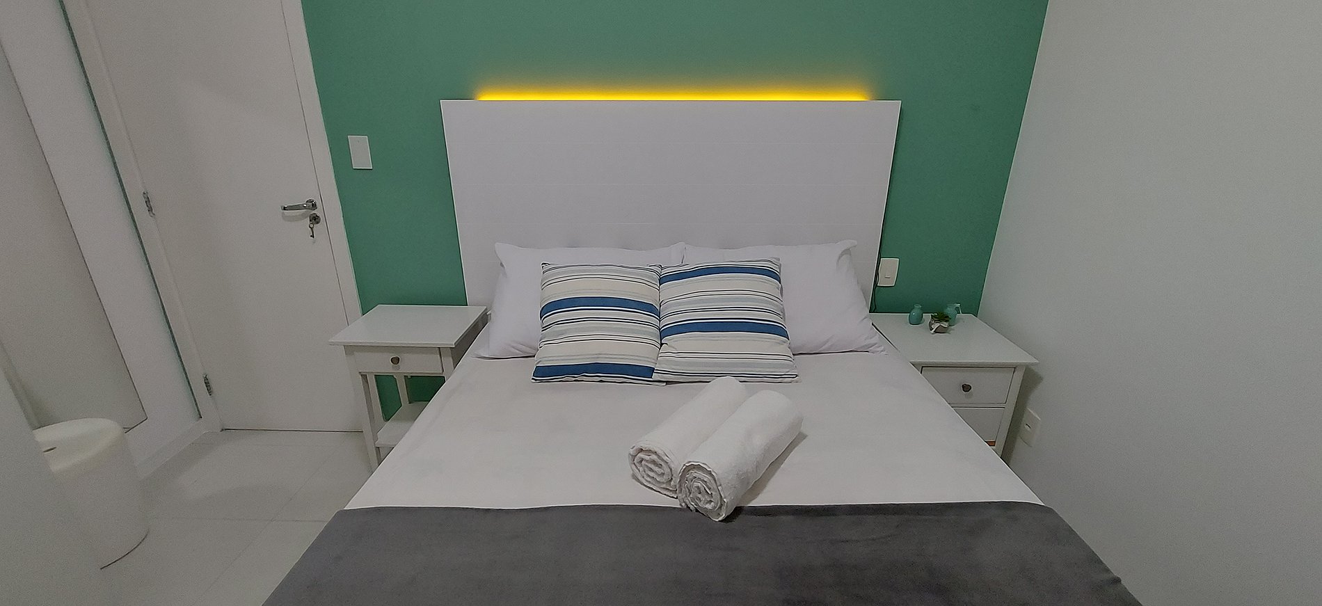 - Dormitorio con cama matrimonial, 2 mesas esquineras, armario, aire acondicionado split, cortina blackout, perchero, TV con canales locales y Chromecast (transmite aplicaciones de celular en el televisor), espejo grande y cesto para ropa