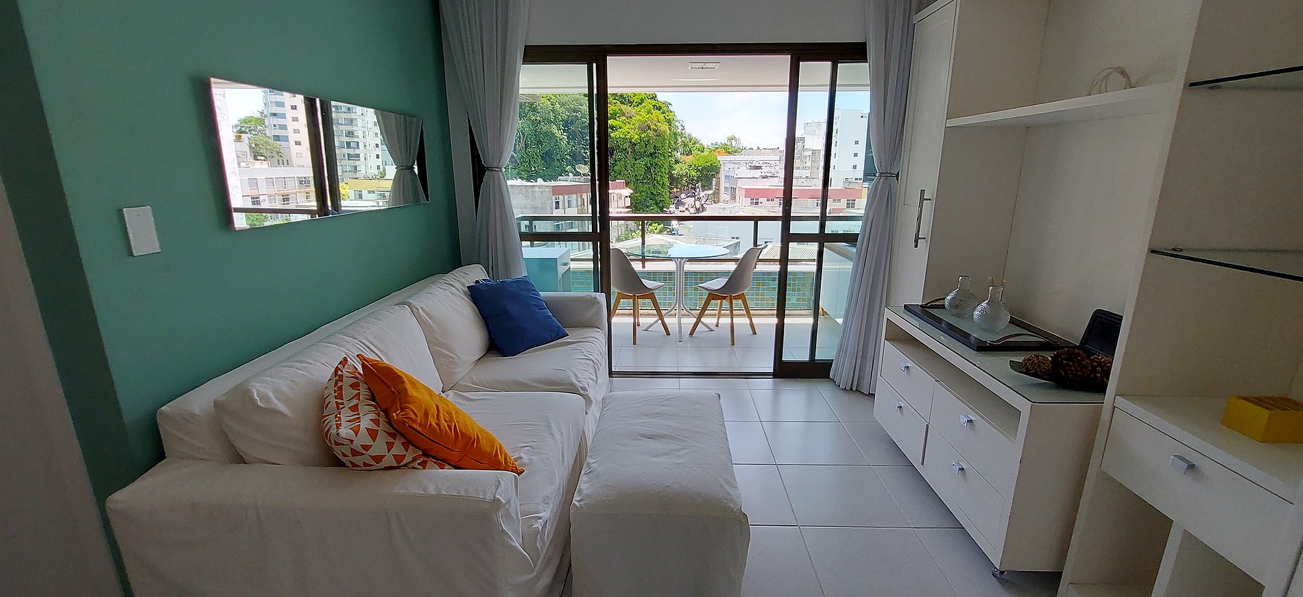 ¡Cómodo y tranquilo departamento en Barra! Sala, balcón, WI-FI, dormitorio con cama matrimonial, aire acondicionado split y TV con canales locales y Chromecast (transmite apps del celular en el TV), cocina equipada. Edificio con piscina, gimnasio, garaje y recepción 24 horas. ¡A 10 minutos caminando de la playa de Porto da Barra!