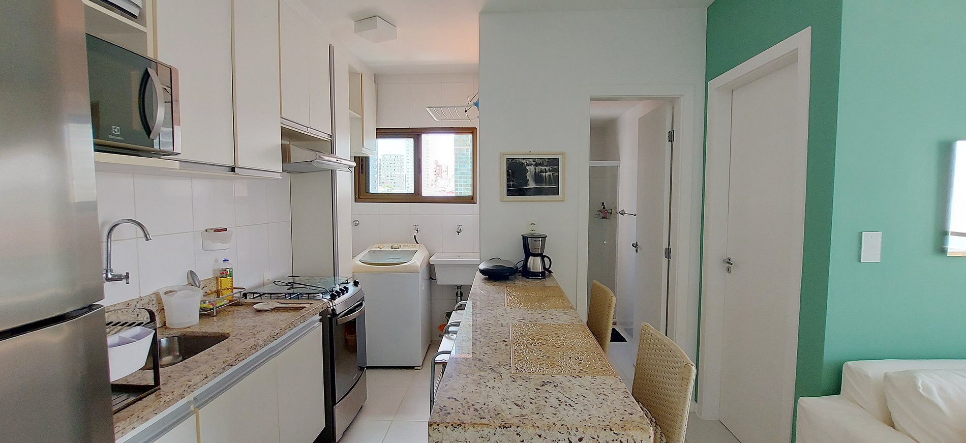 - Cocina completa con banca y 2 taburetes altos, filtro de agua, cafetera eléctrica, termo, sandwichera, cocina de 4 fuegos, purificador de aire, refrigerador duplex, microondas, menaje básico de cocina.