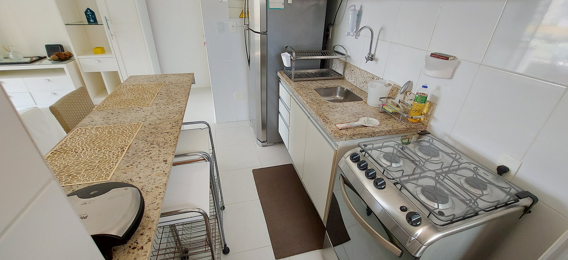 - Cocina completa con banca y 2 taburetes altos, filtro de agua, cafetera eléctrica, termo, sandwichera, cocina de 4 fuegos, purificador de aire, refrigerador duplex, microondas, menaje básico de cocina.