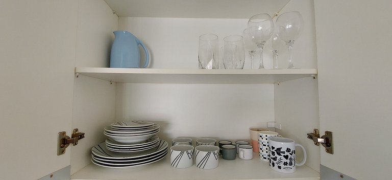 - Cocina completa con banca y 2 taburetes altos, filtro de agua, cafetera eléctrica, termo, sandwichera, cocina de 4 fuegos, purificador de aire, refrigerador duplex, microondas, menaje básico de cocina.
