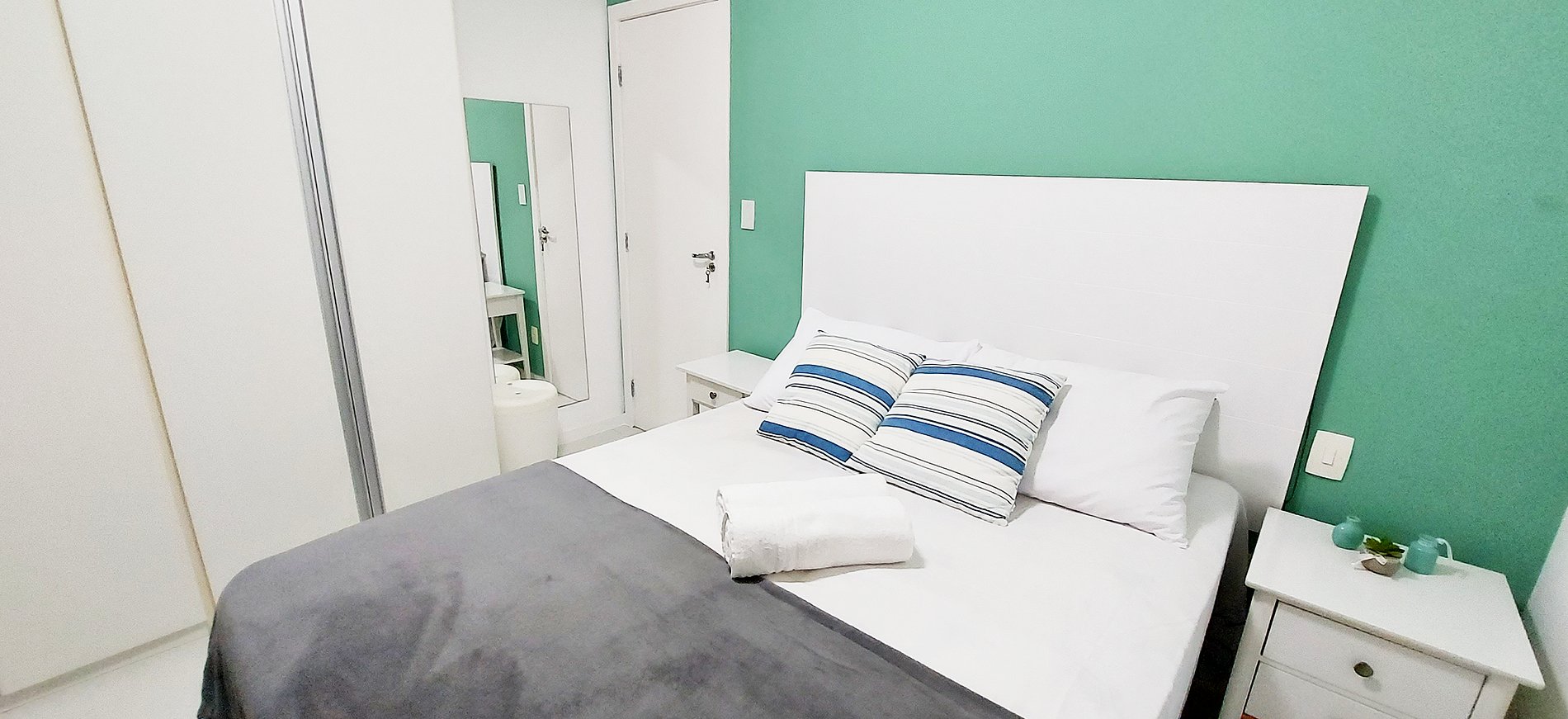 - Dormitorio con cama matrimonial, 2 mesas esquineras, armario, aire acondicionado split, cortina blackout, perchero, TV con canales locales y Chromecast (transmite aplicaciones de celular en el televisor), espejo grande y cesto para ropa