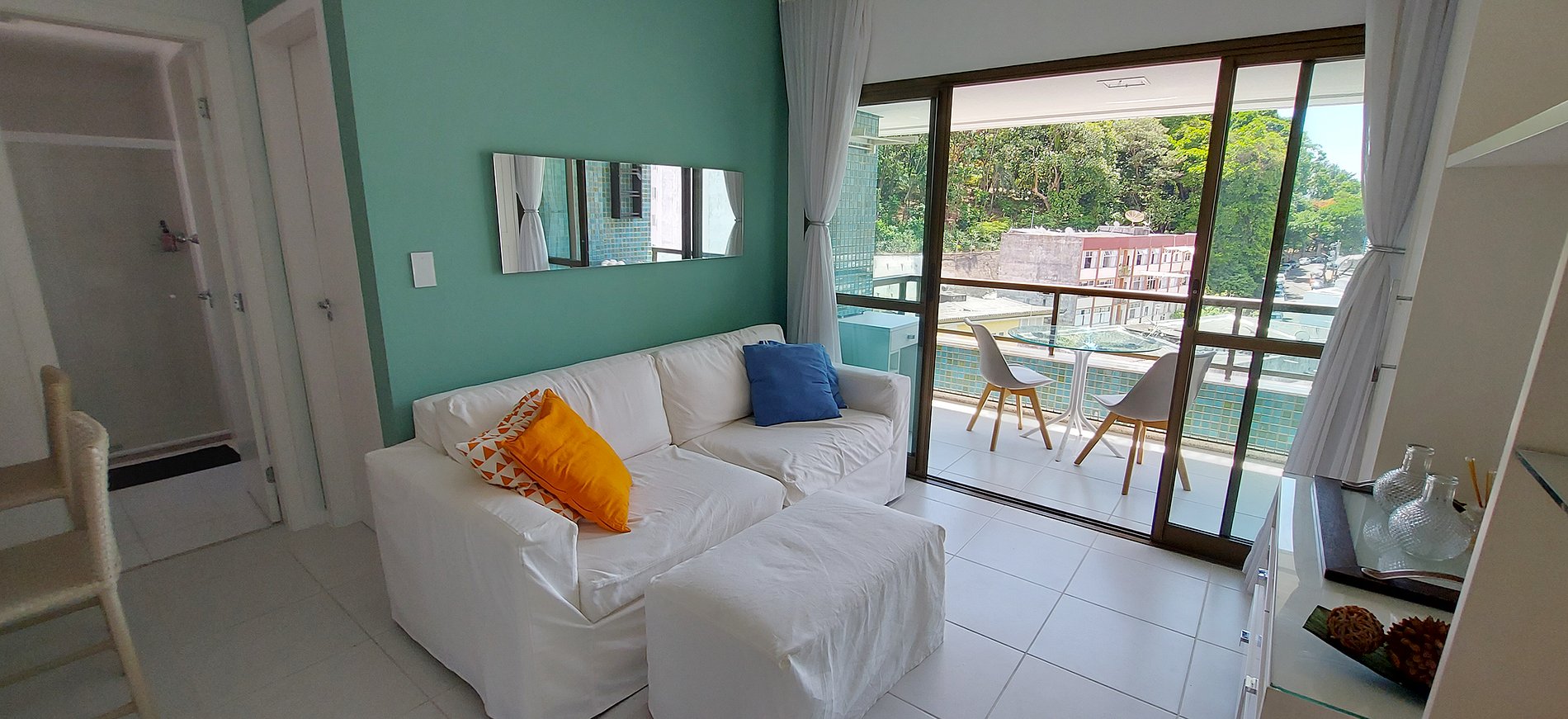 ¡Cómodo y tranquilo departamento en Barra! Sala, balcón, WI-FI, dormitorio con cama matrimonial, aire acondicionado split y TV con canales locales y Chromecast (transmite apps del celular en el TV), cocina equipada. Edificio con piscina, gimnasio, garaje y recepción 24 horas. ¡A 10 minutos caminando de la playa de Porto da Barra!