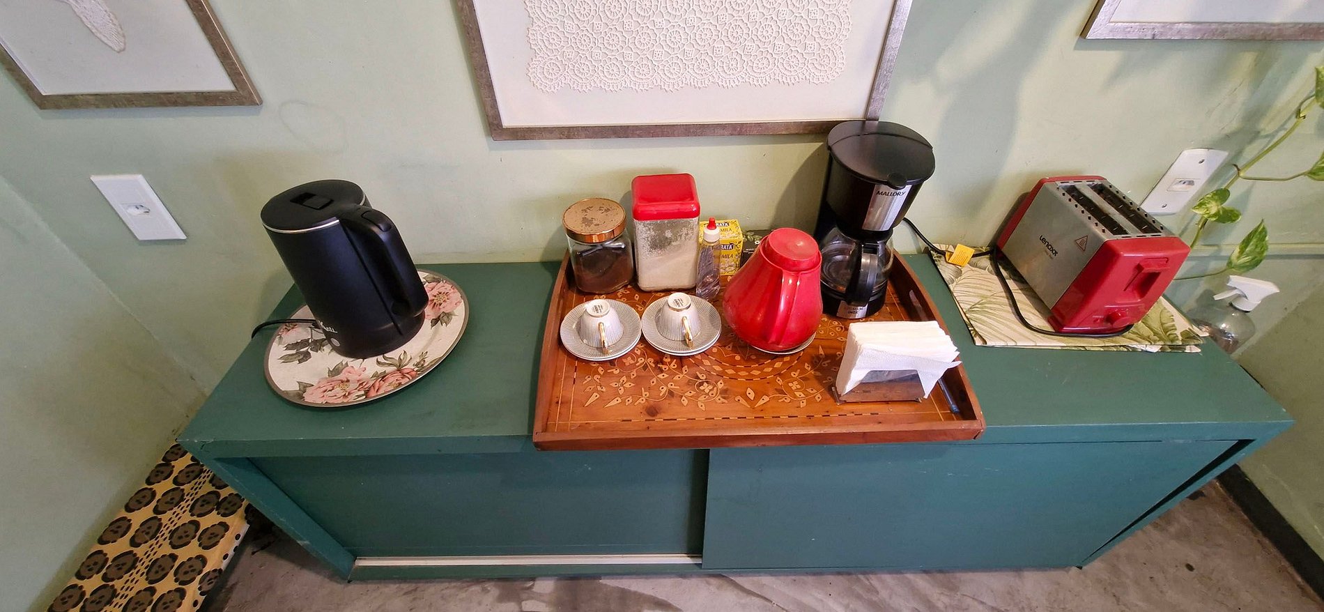 - COCINA: refrigerador, placa de cocina de 2 fuegos, campana extractora, tostadora, cafetera eléctrica, horno eléctrico pequeño, licuadora y varios accesorios de cocina.