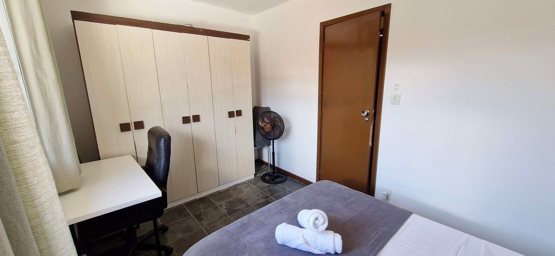 - DORMITORIO 1: cama doble, armario con perchas, ventilador de mesa, mesa auxiliar con lámpara, cortina opaca, tabla de planchar, plancha, banco de plástico blanco, aire acondicionado split
