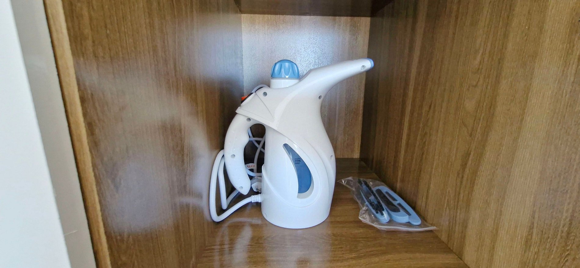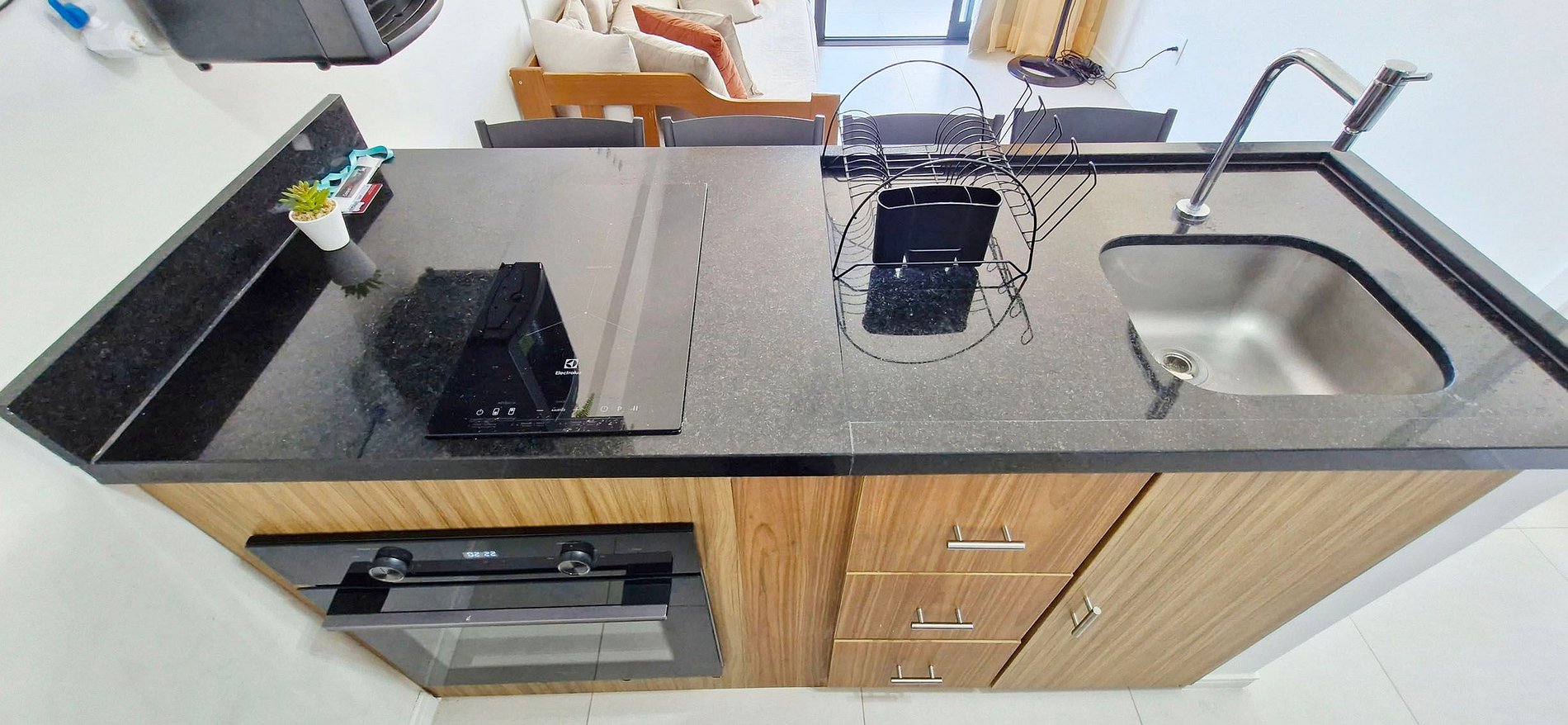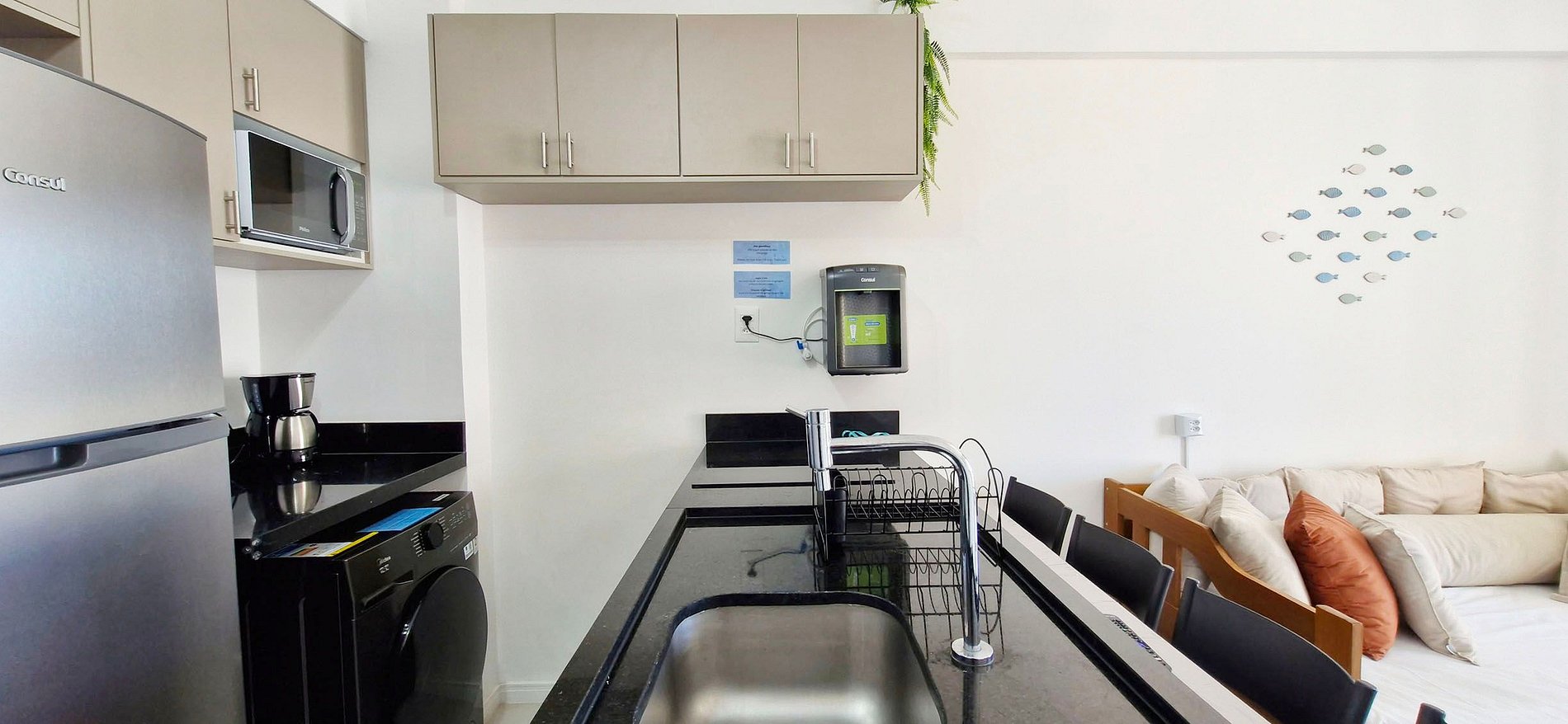 - COCINA: sandwichera, cafetera eléctrica, refrigerador de dos puertas, licuadora, microondas, placa de inducción de dos quemadores, horno eléctrico, filtro de agua, ollas, sartenes, cubiertos, vasos y diversos accesorios de cocina. Lavadora (lavadora y secadora).