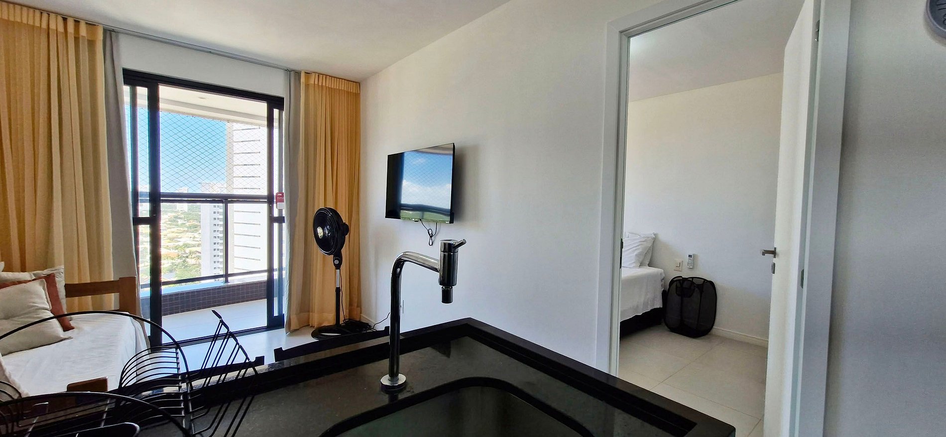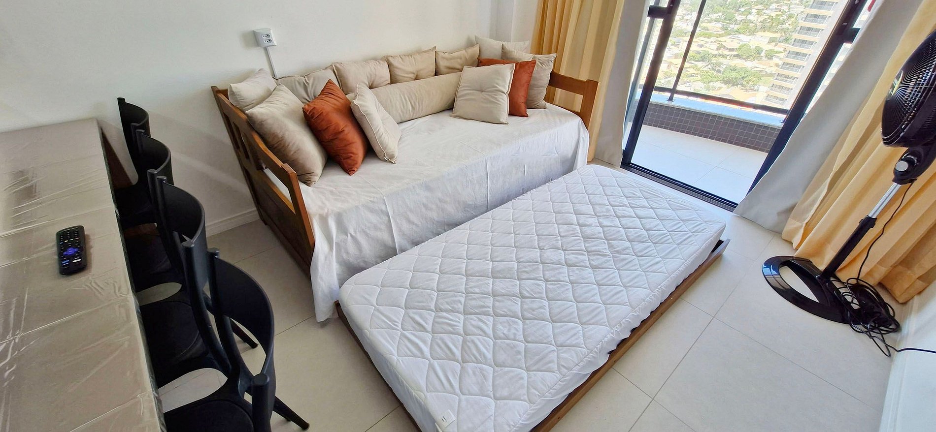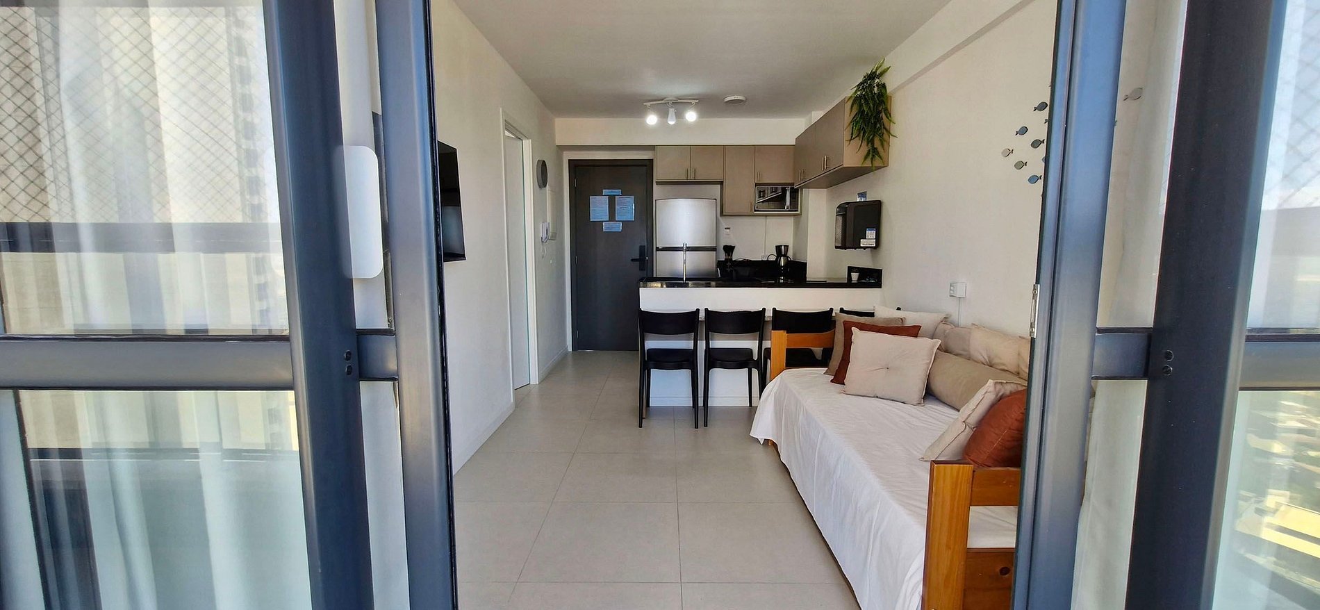 Apartamento de una habitación en un edificio frente al mar con vistas a la playa de Jaguaribe. El edificio cuenta con piscina exterior con vistas al mar, gimnasio climatizado, parque infantil, espacio de coworking y aparcamiento. Hay un supermercado y un McDonald's al lado.