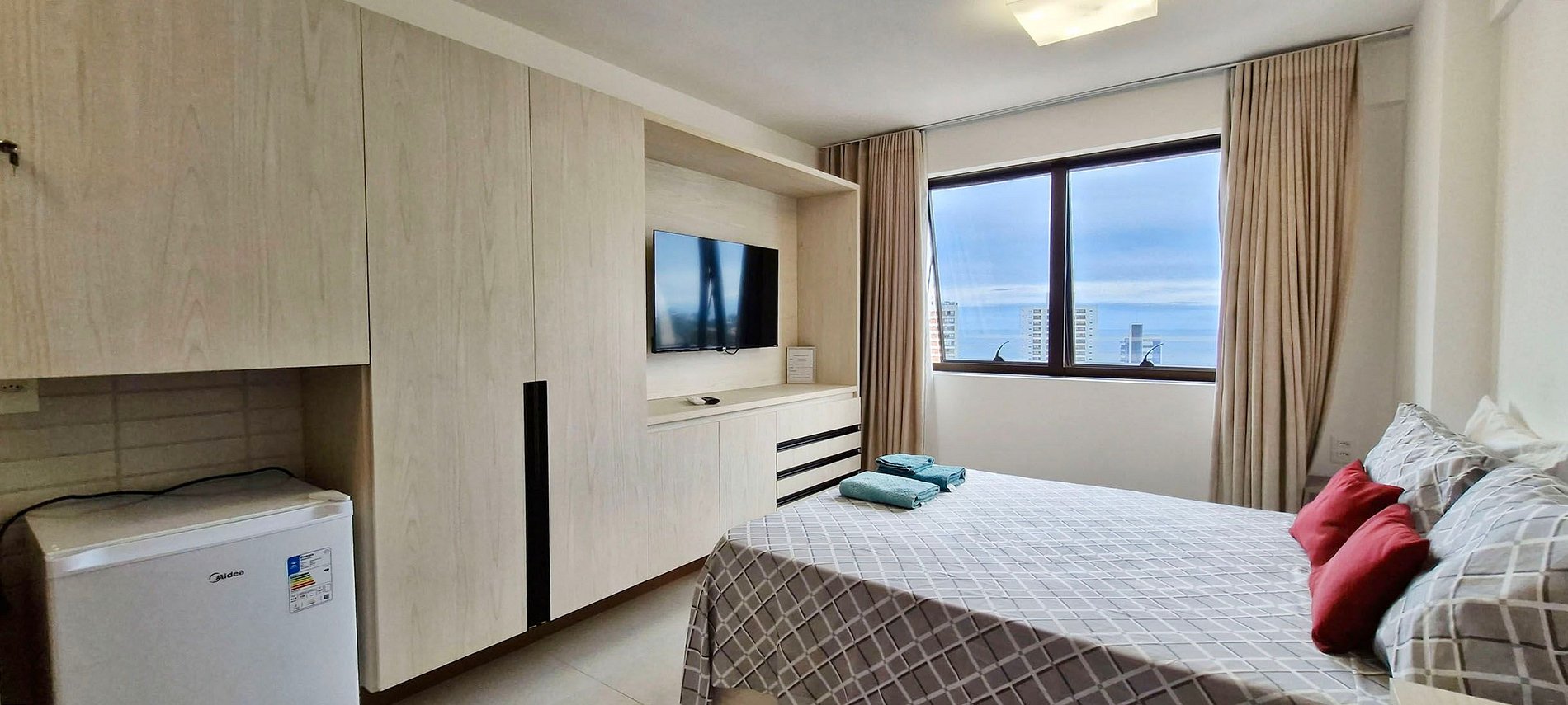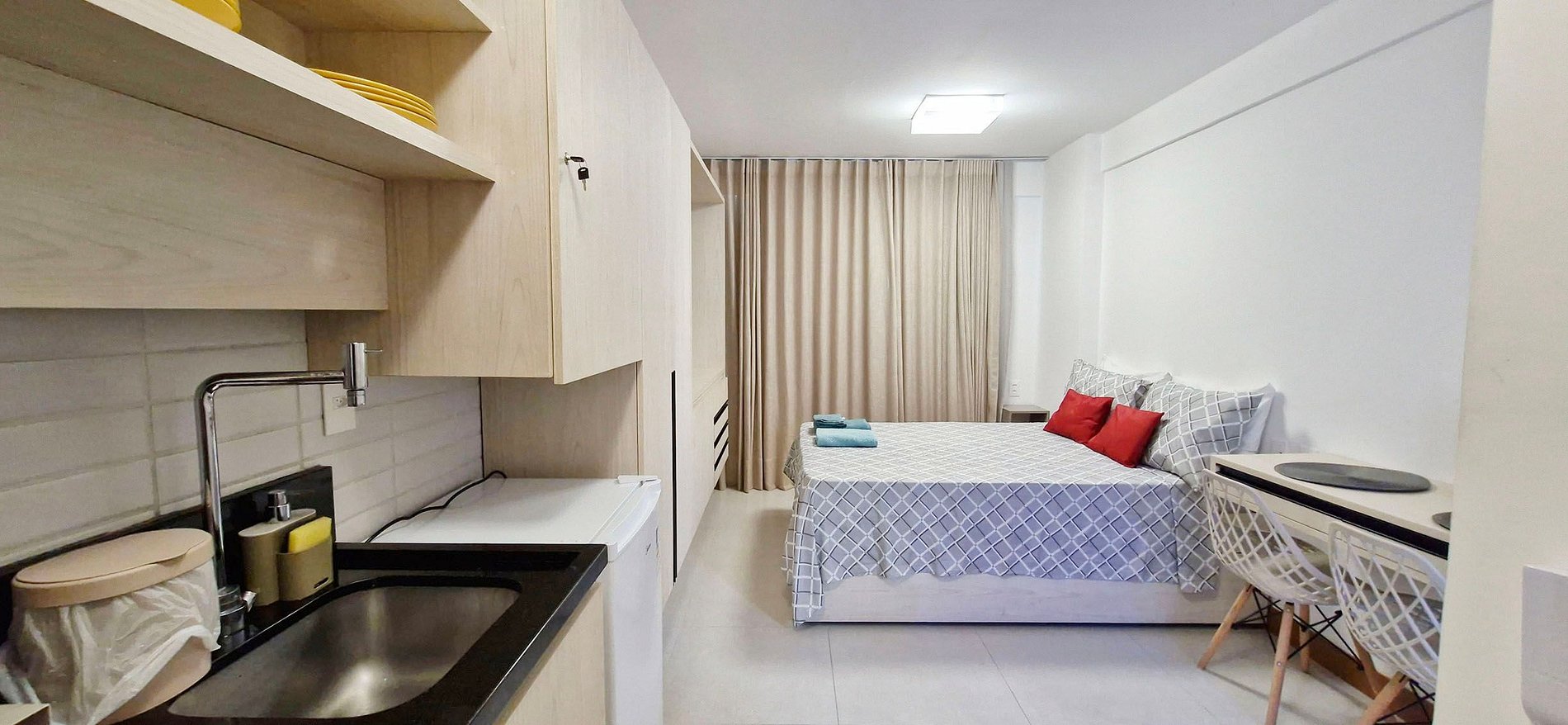 Muy cerca del shopping Barra y del Carnaval Barra-Ondina. Cuenta con cama doble y auxiliar individual, smart TV con antena local, WI-FI, aire acondicionado split y cocina. Terraza con piscina, gimnasio, garaje y recepción 24 hs. Sala de juegos, coworking. Lavandería y minimarket con cobro adicional.
