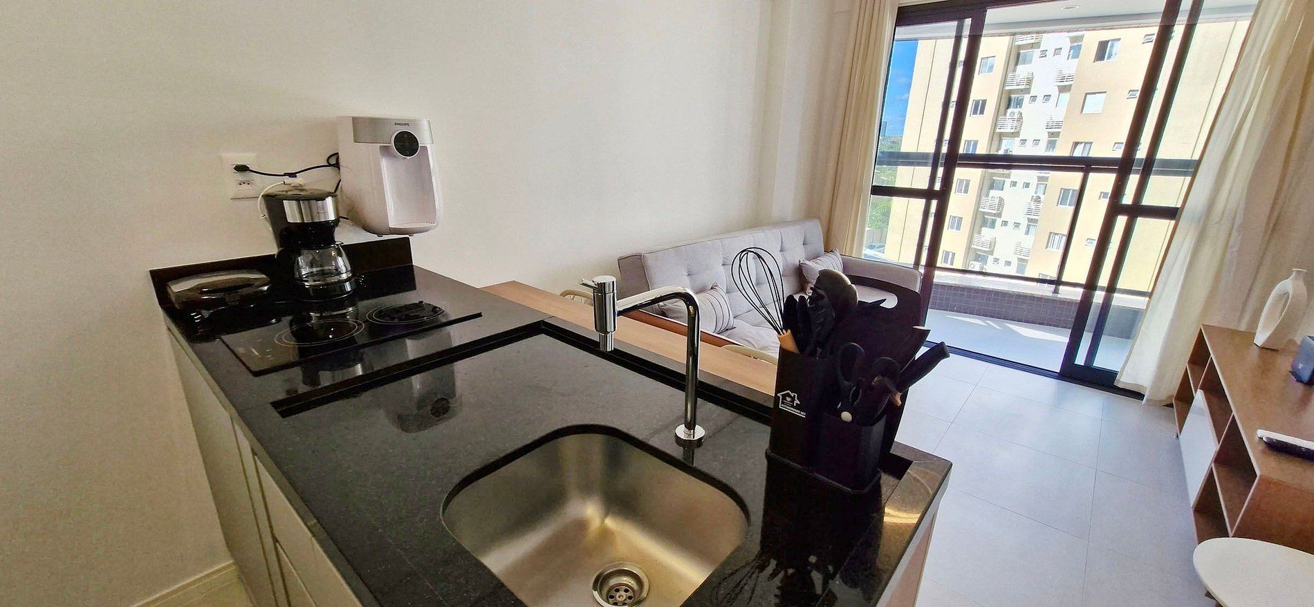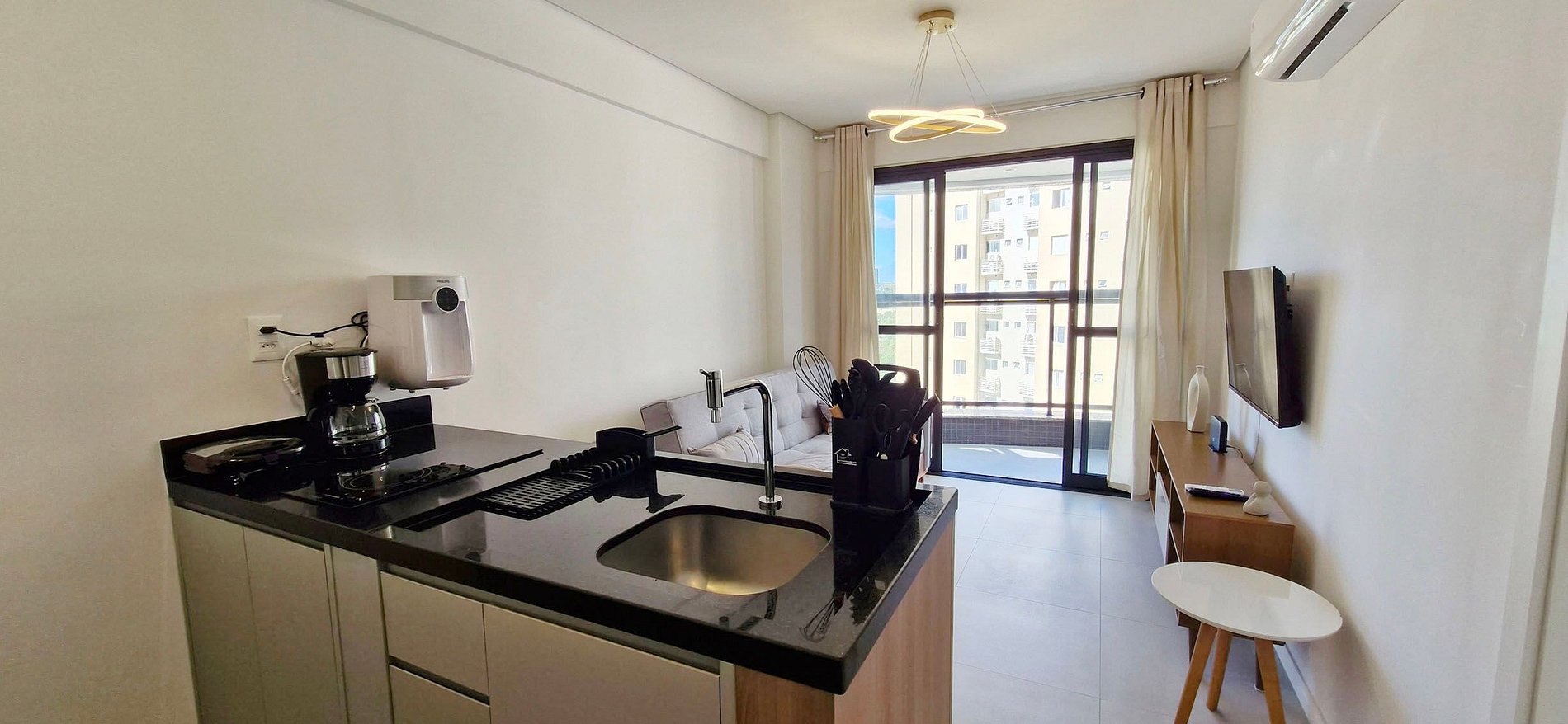 Al lado del supermercado y Mc Donald's! Edificio con piscina para adultos y niños, gimnasio, coworking, parque infantil, garaje rotatorio y recepción 24h. Habitación con cama doble y aire acondicionado split. Sala con sofá cama doble, aire acondicionado split, smart TV. Balcón con vista al mar. WI-FI, cocina completa. Secador de pelo y plancha.