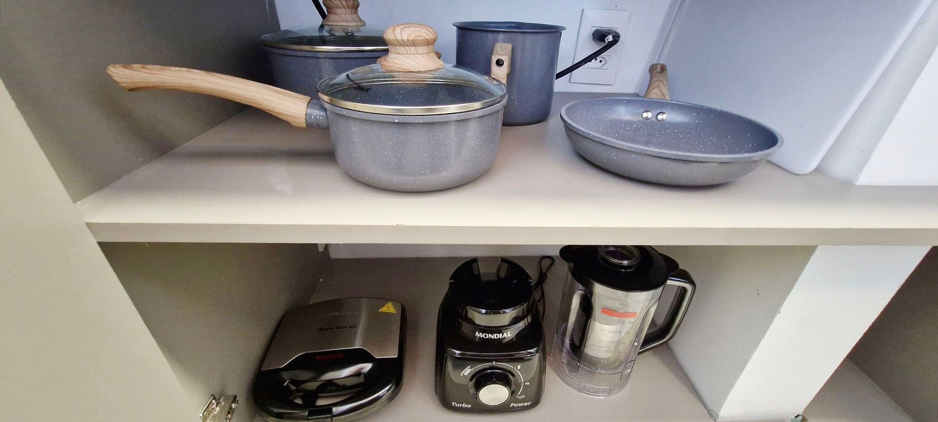 - COCINA: sandwichera, cafetera eléctrica, hervidor, frigorífico de dos puertas, licuadora, microondas, placa de inducción de dos fuegos, campana extractora, filtro de agua, ollas, sartenes, cubiertos, vasos y diversos accesorios de cocina.