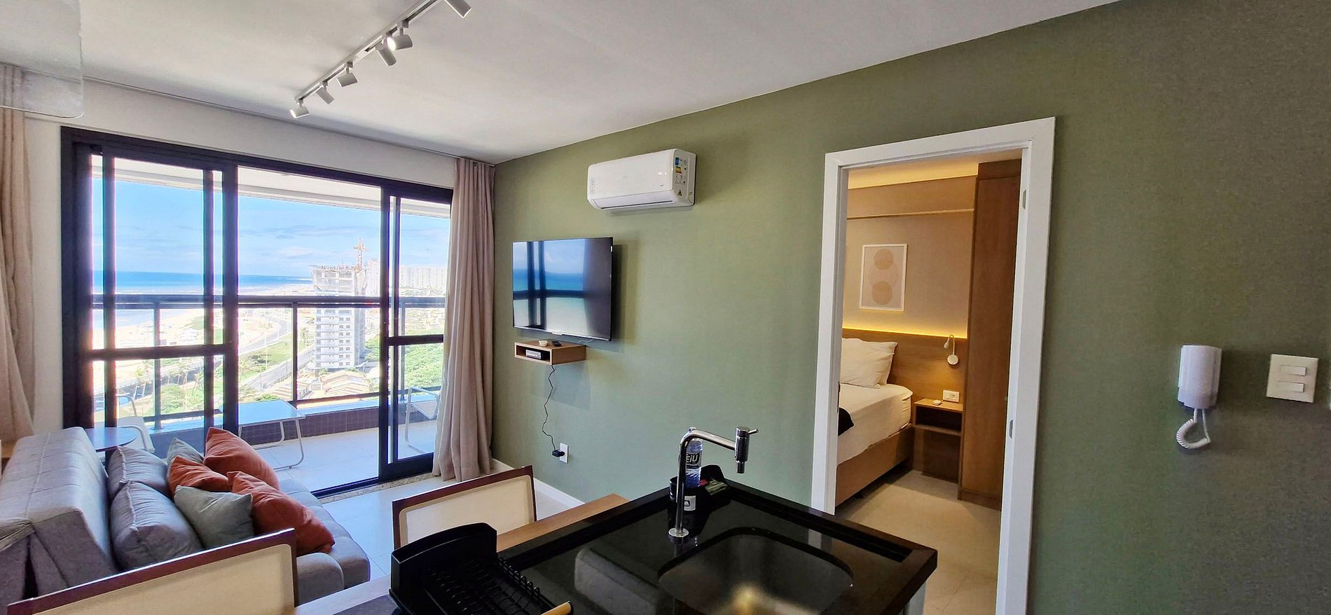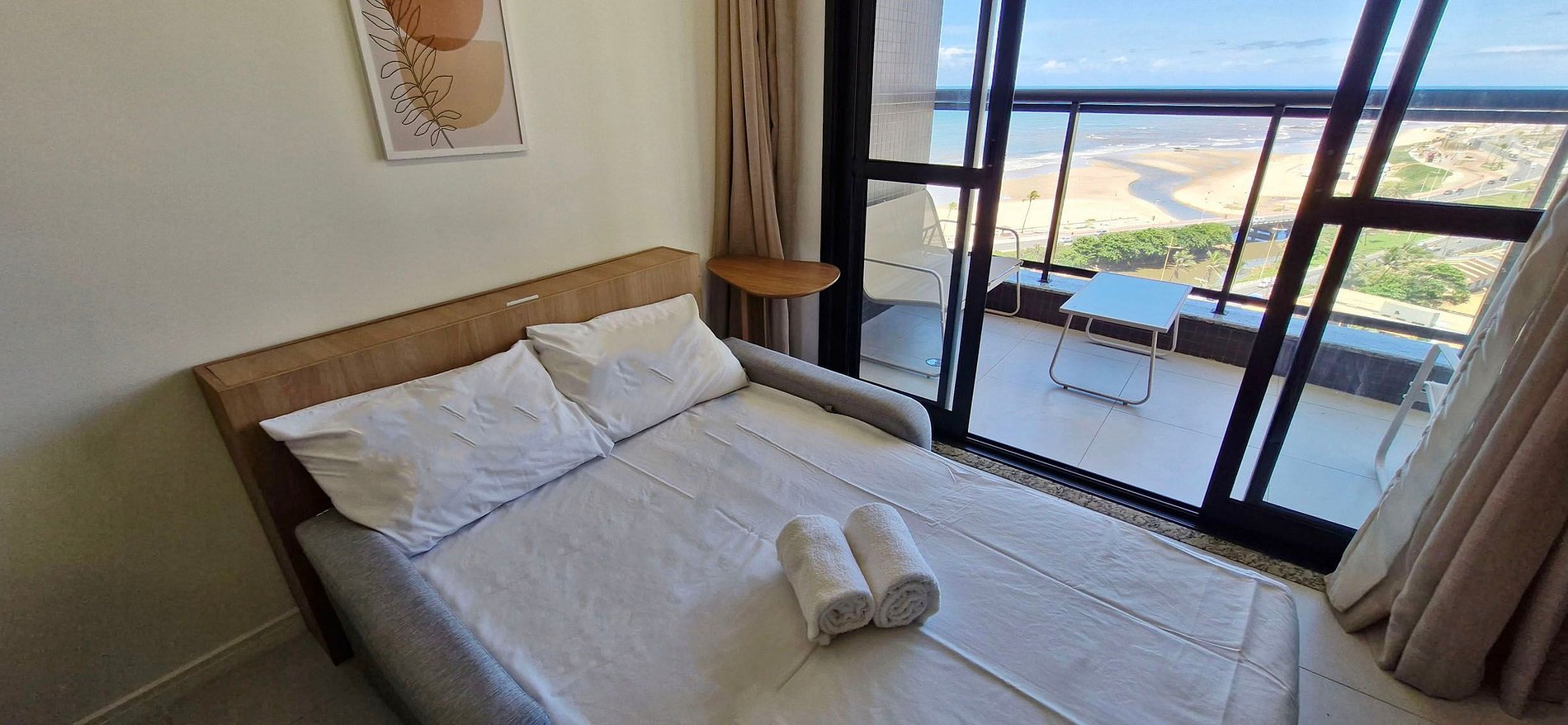 Quarto y sala climatizados, con balcón y vista al mar en Beach Class!