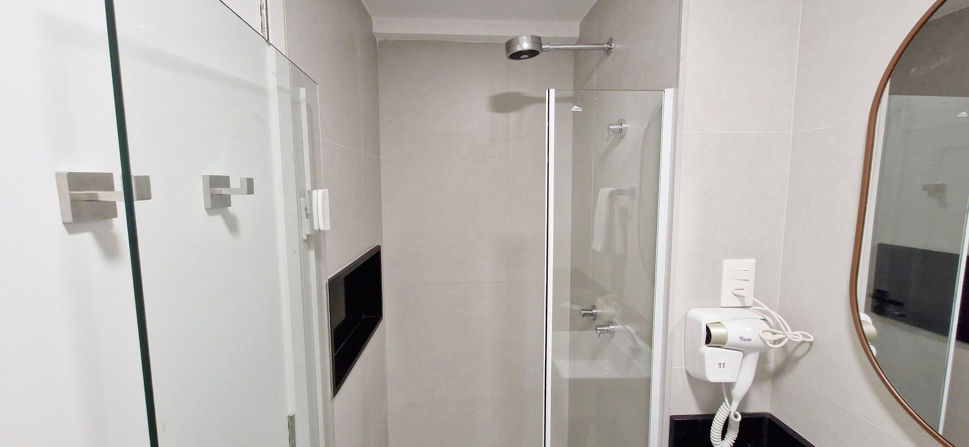 - BAÑO: armario, espejo, cabina de ducha, ducha eléctrica, secador de pelo