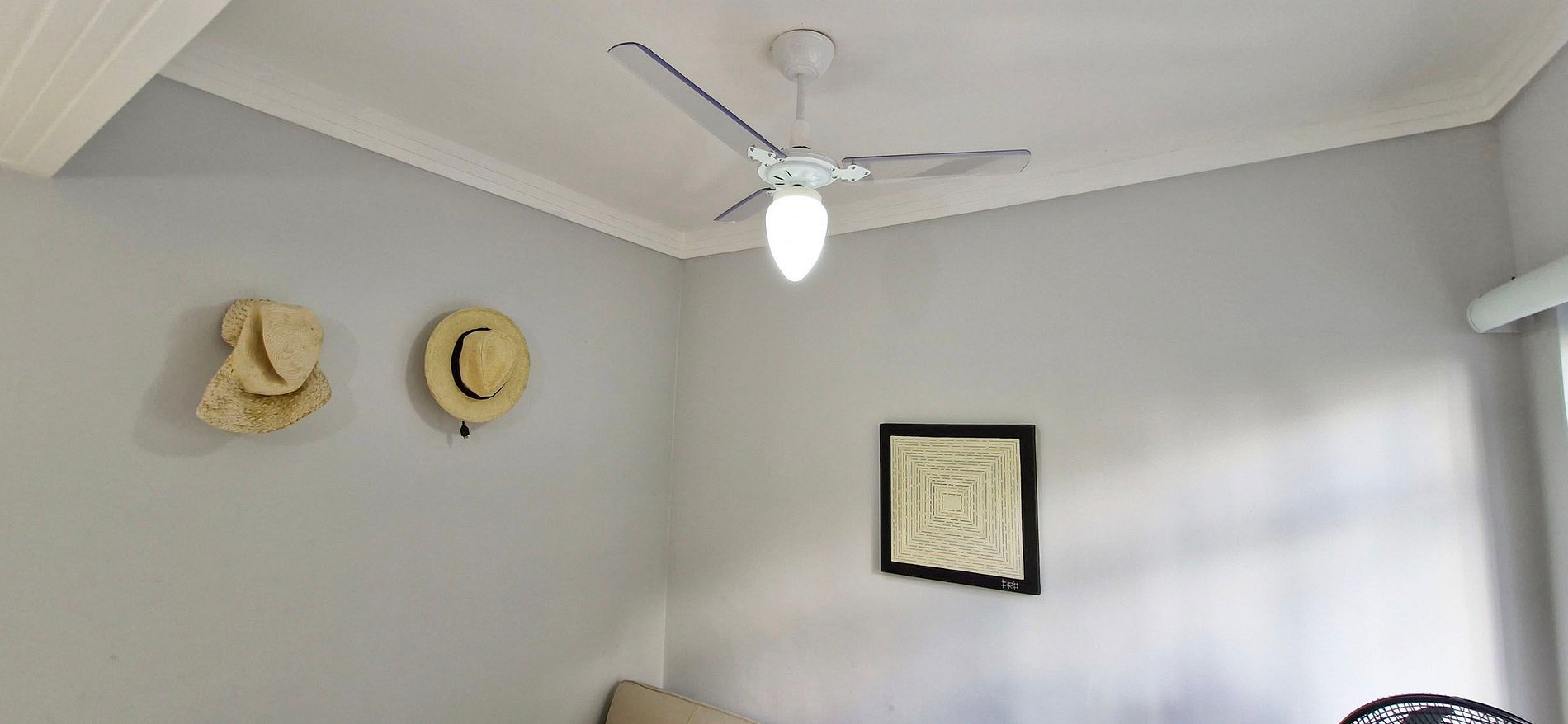 SALA DE ESTAR - Sofá grande, 2 pufs negros, mueble de TV, Wi-Fi, TV con Chromecast, ventilador de techo, cuadros decorativos, hamaca.