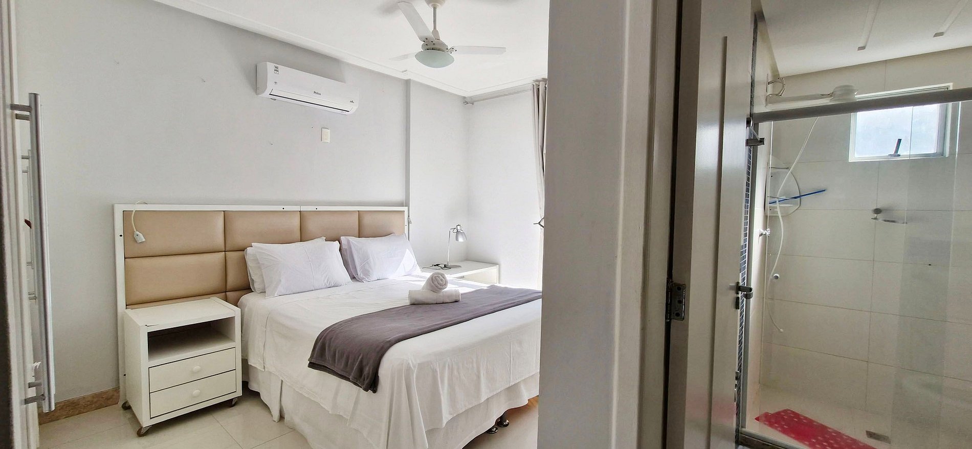 DORMITORIO 1 (SUITE) - Cama doble, aire acondicionado split, 2 mesitas de noche, lámpara de noche, mueble de TV, cortinas opacas, armario, armario, plancha. BAÑO con lavabo, armario, espejo grande, cabina de ducha, bidé, ducha eléctrica.