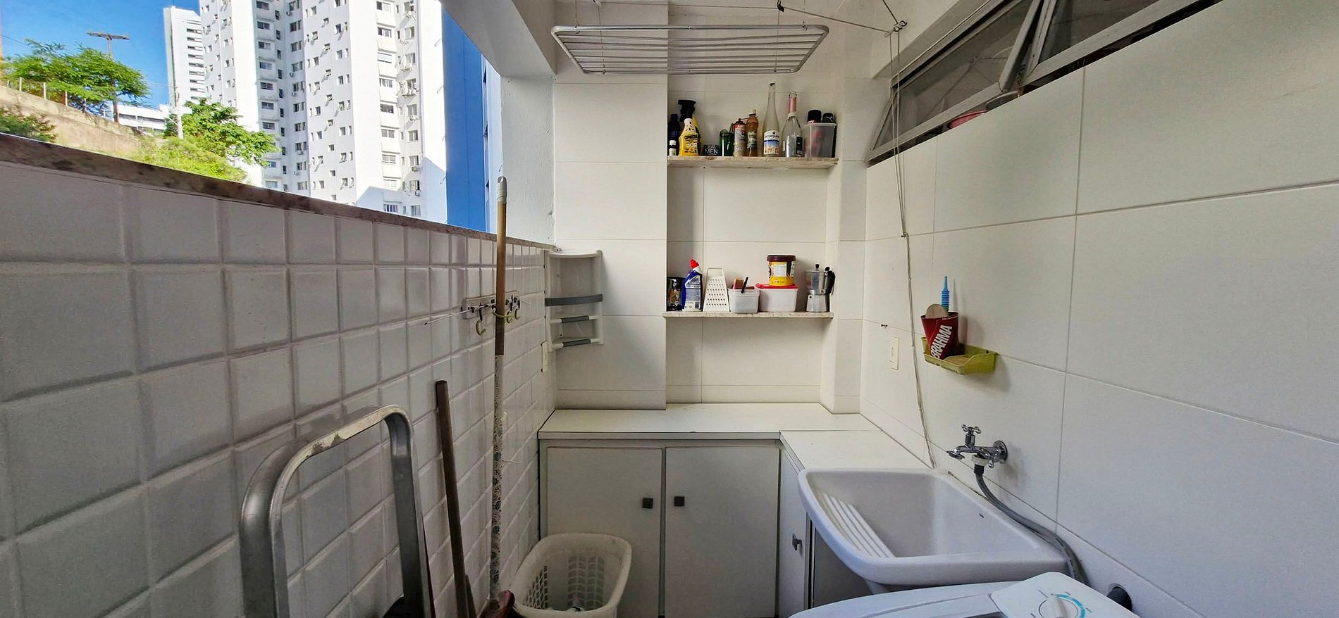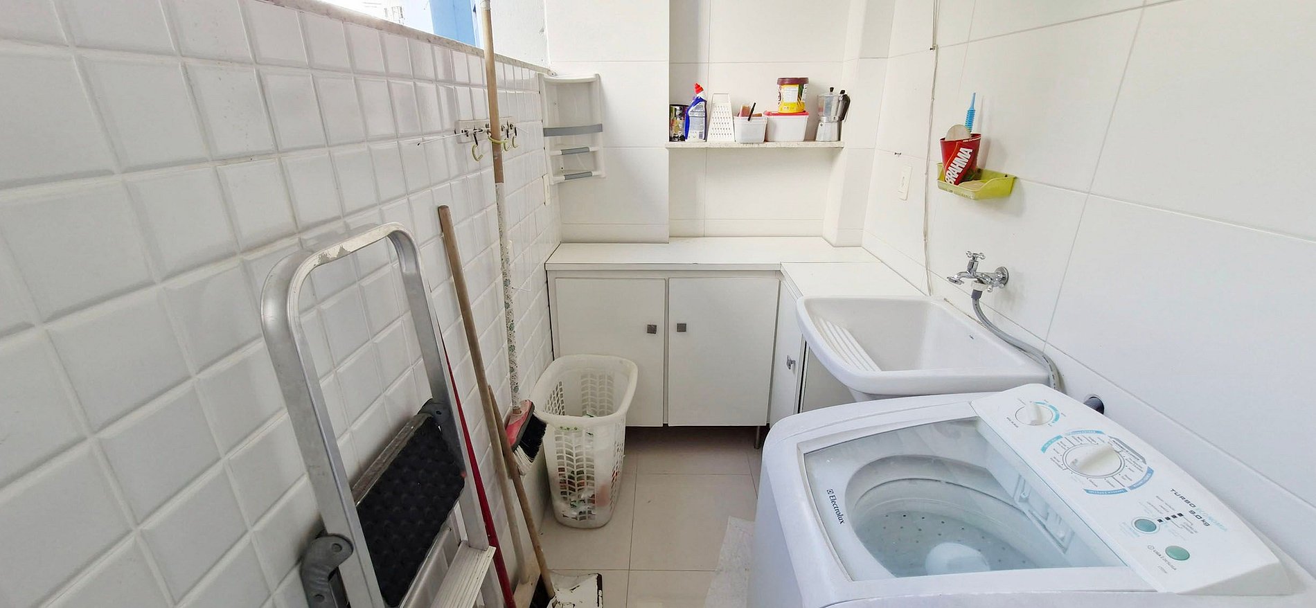 LAVADERO: fregadero con armario, lavadora, tendedero de techo, escalera pequeña.
