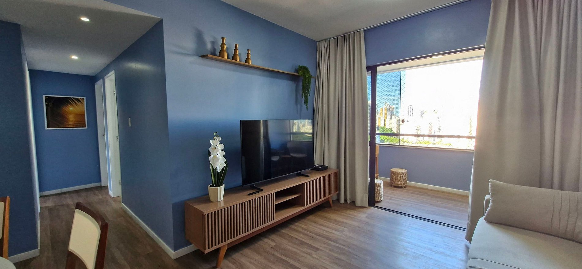 - SALA DE ESTAR: sofá cama matrimonial con manta, mueble para TV, smart TV, mesa auxiliar, ventilador de mesa, cortina ligera
