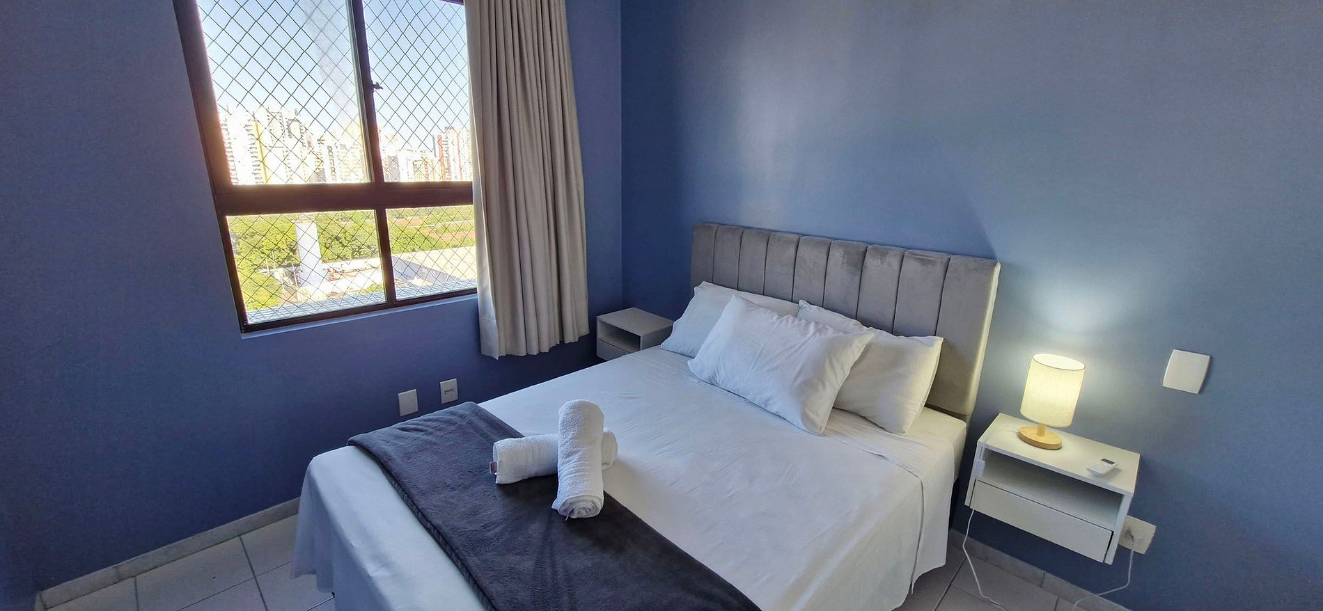 - DORMITORIO 1: cama matrimonial, armario, malla de protección, 2 mesitas de noche, lámpara, aire acondicionado split, cortina blackout.