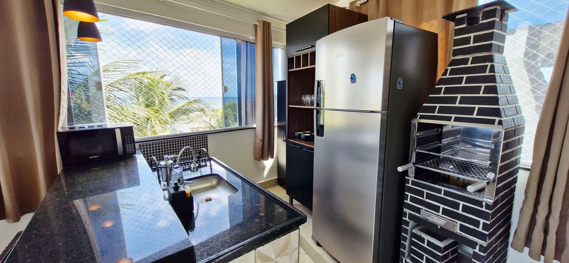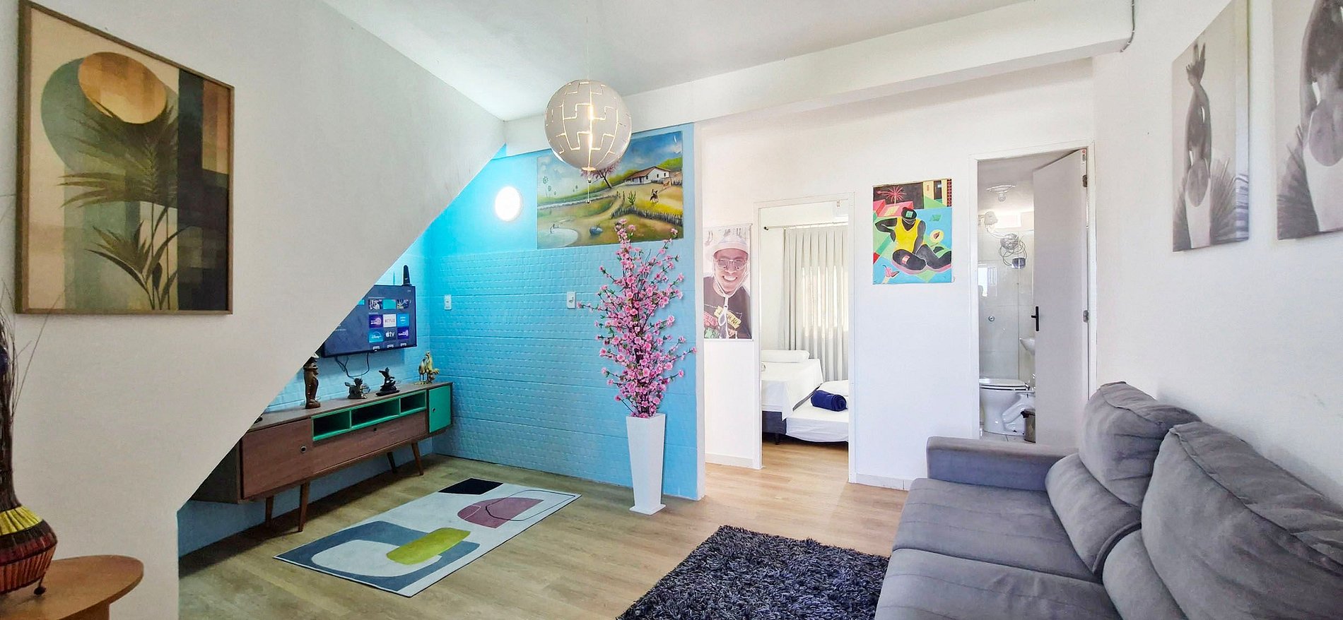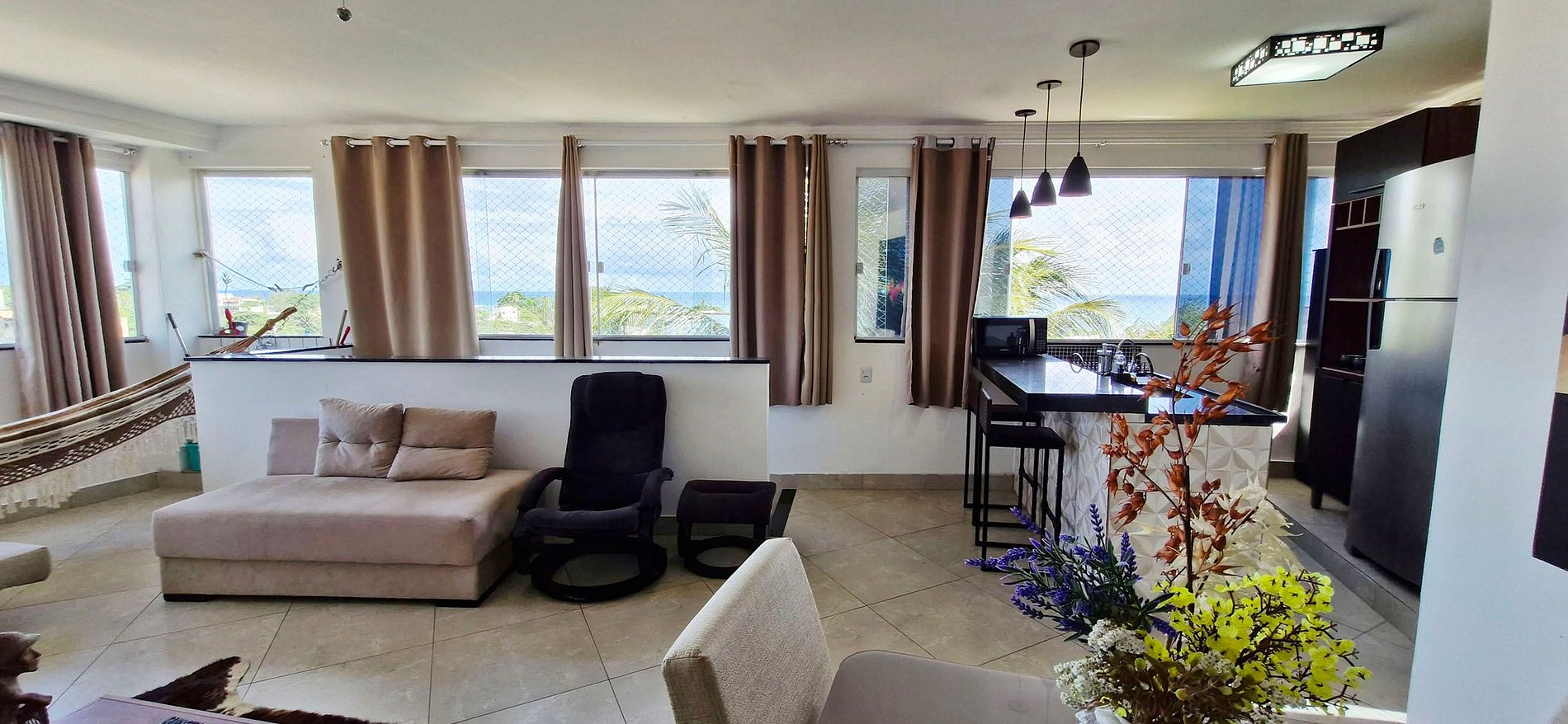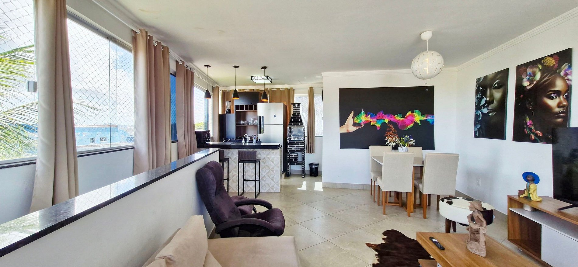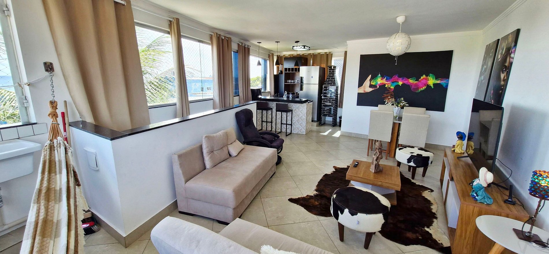 Apartamento de dos pisos con vista al mar en la Ladeira do Abaeté. Ubicado en el segundo piso de un edificio sencillo, sin ascensor. Es necesario subir dos tramos de escalera para acceder al inmueble. Al entrar encuentras una sala de estar con smart TV y wifi, dos dormitorios con aire acondicionado y baño social. Arriba, otra sala de estar con vista al mar, comedor, smart TV, hamaca, cocina con parrilla y baño.