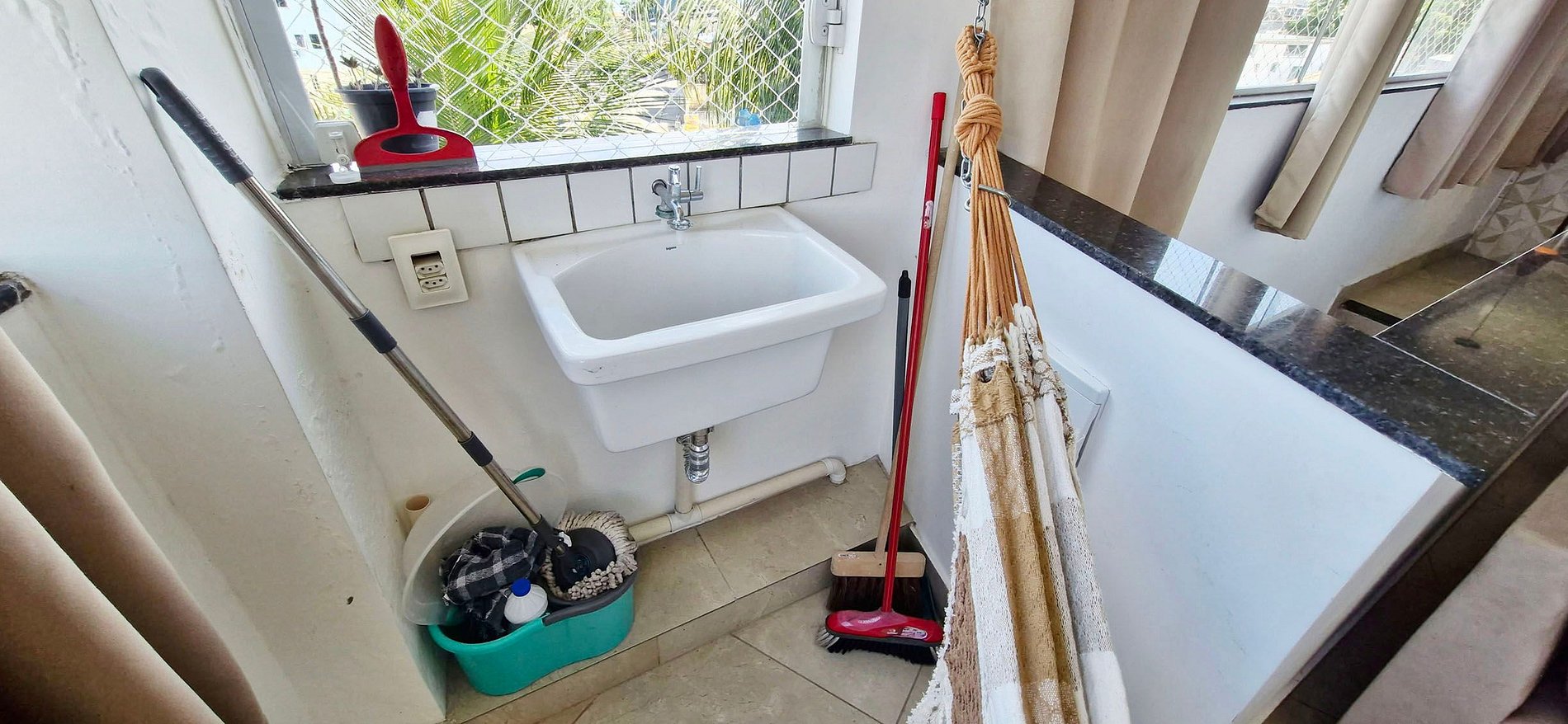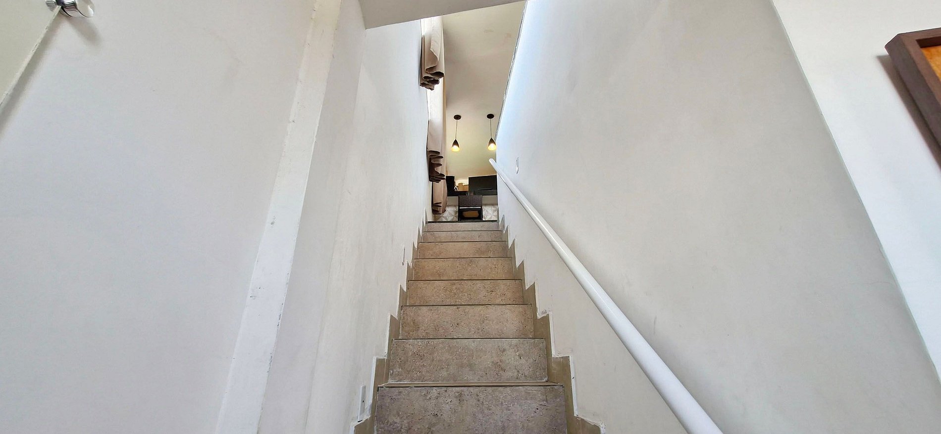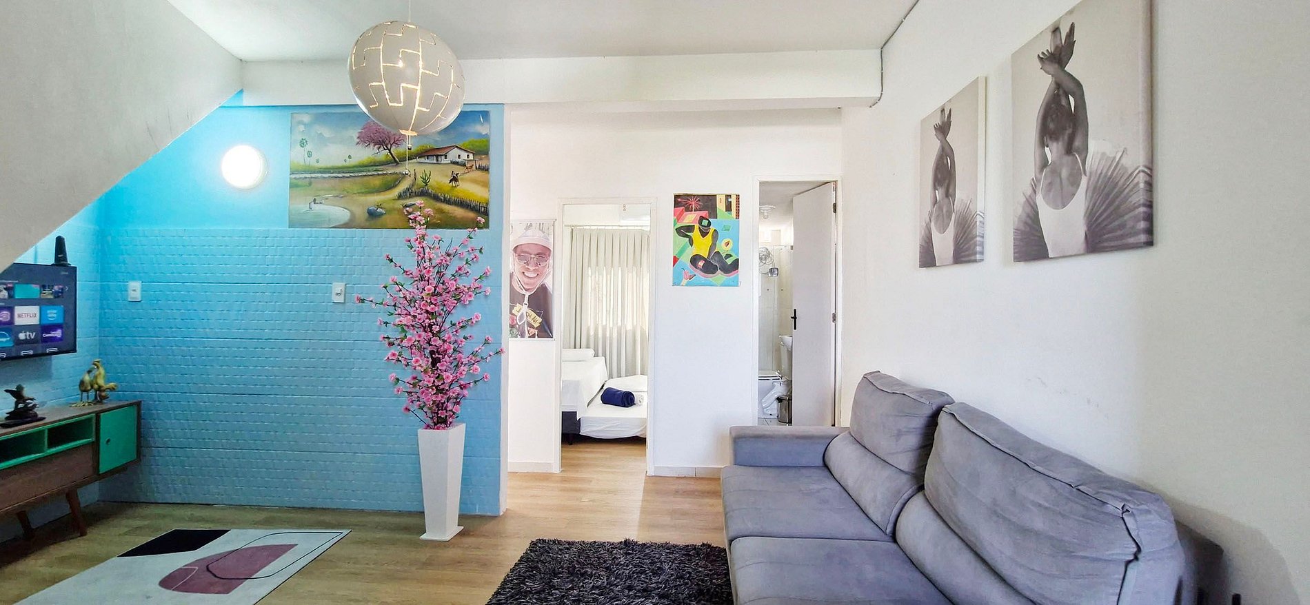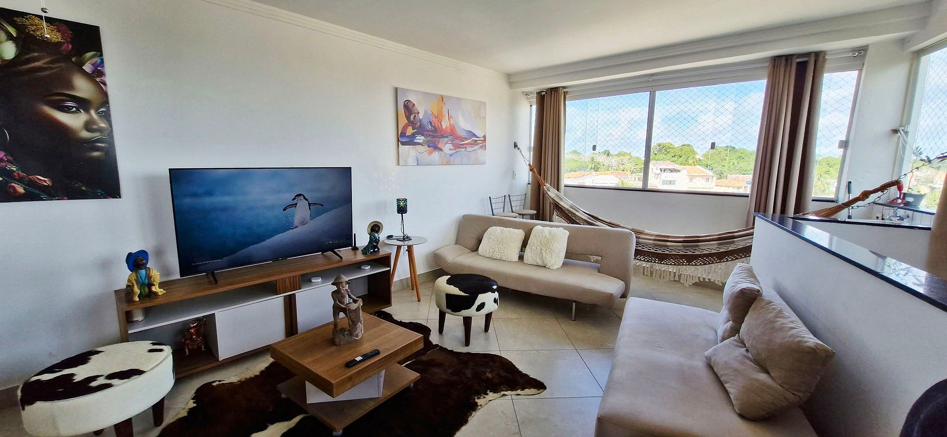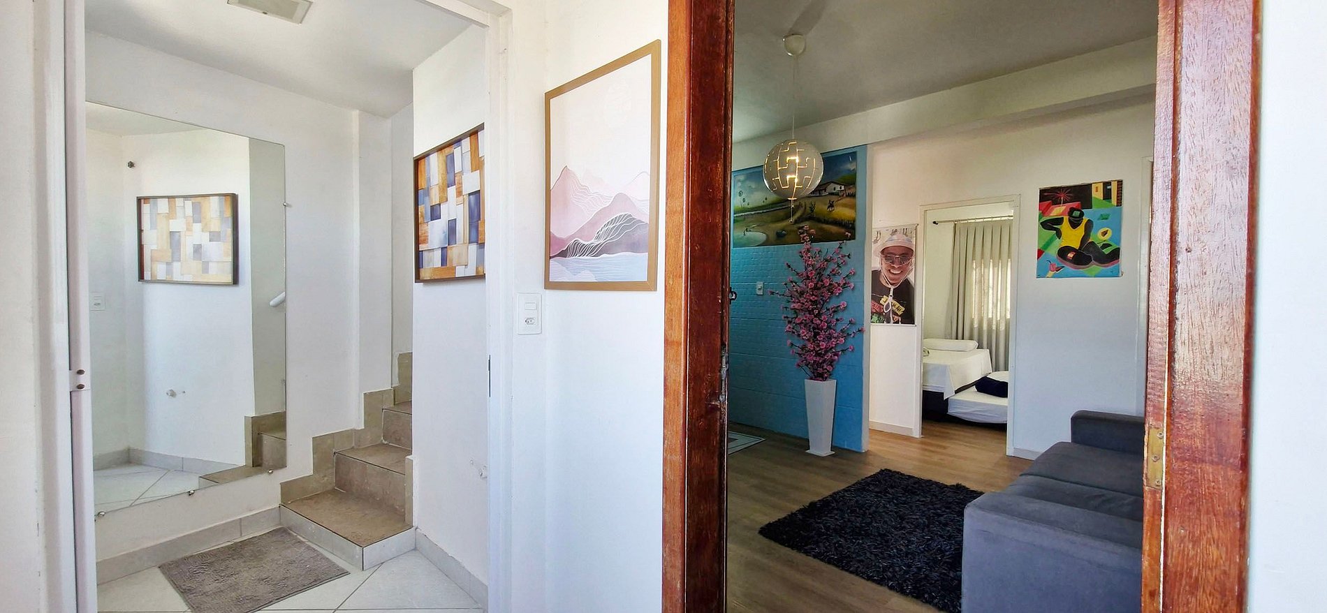 Apartamento de dos pisos con vista al mar en la Ladeira do Abaeté. Ubicado en el segundo piso de un edificio sencillo, sin ascensor. Es necesario subir dos tramos de escalera para acceder al inmueble. Al entrar encuentras una sala de estar con smart TV y wifi, dos dormitorios con aire acondicionado y baño social. Arriba, otra sala de estar con vista al mar, comedor, smart TV, hamaca, cocina con parrilla y baño.