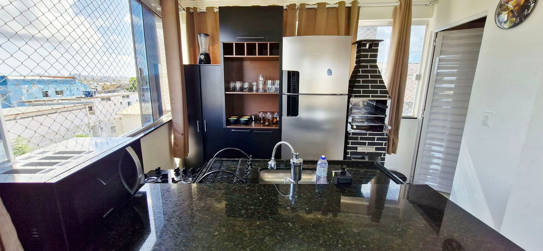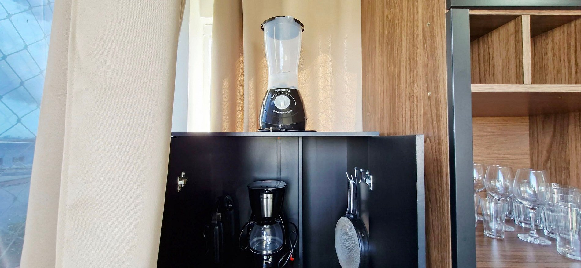 - Cocina con barra y 2 bancos altos, parrilla, nevera dúplex, filtro de agua, sandwichera, licuadora, cafetera eléctrica, cocina a gas de 4 fuegos, microondas y utensilios básicos de cocina. Plancha.