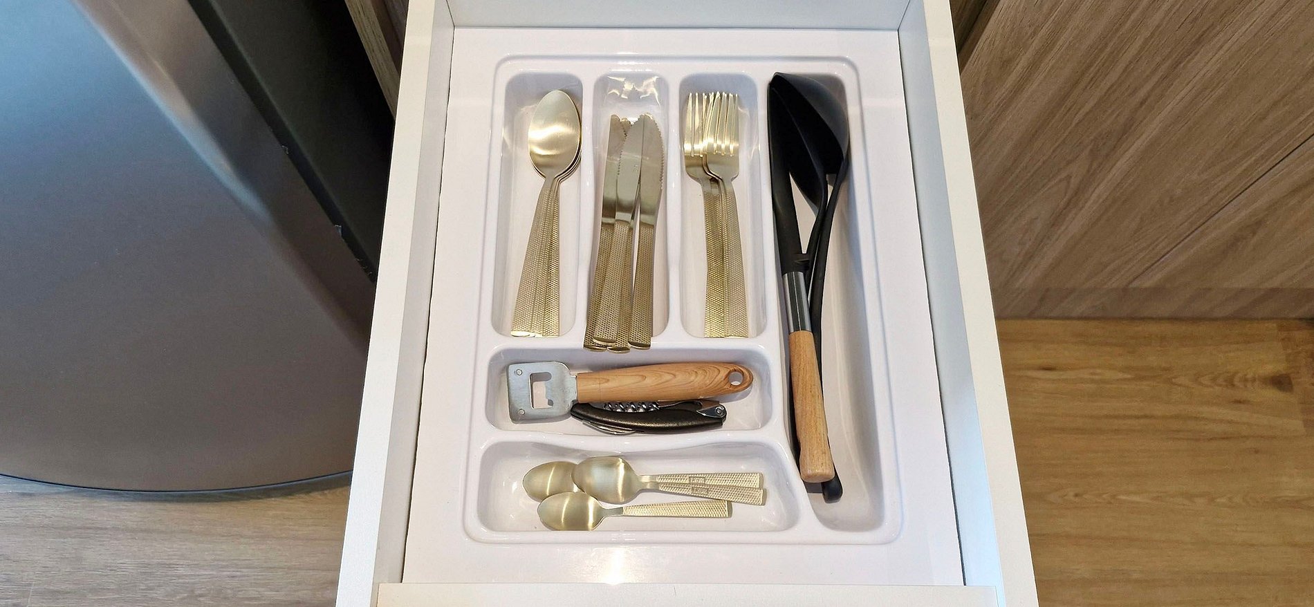 - COCINA: nevera de dos puertas, sandwichera, termo, licuadora, microondas, placa de inducción de dos fuegos, filtro de agua, ollas, sartenes, cubiertos, vasos y diversos accesorios de cocina.