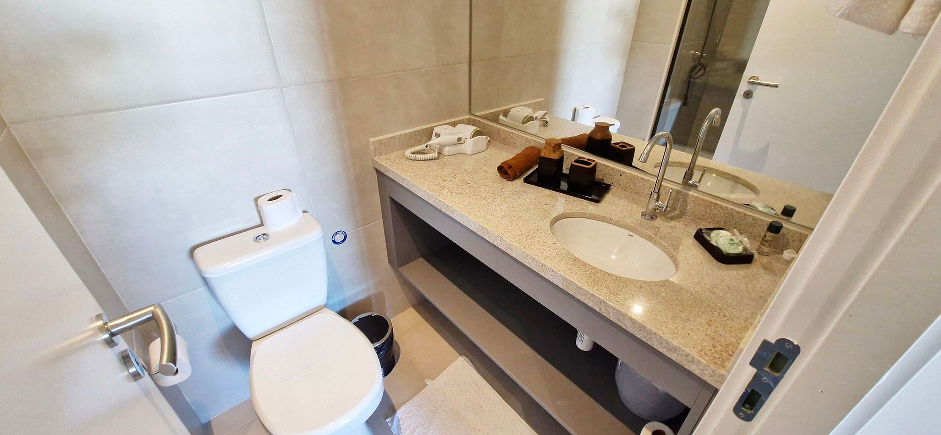 • No se pueden arrojar residuos sólidos al inodoro (incluido papel higiénico), le solicitamos que utilice el contenedor provisto. De lo contrario, el inodoro puede obstruirse y cobramos R$ 150 para destaparlo.