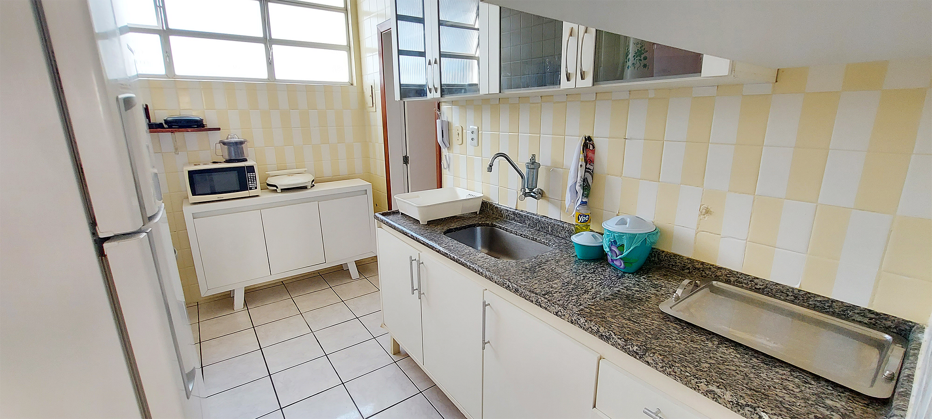 - Cocina con bancada y alacenas, filtro de agua, refrigerador dúplex, estufa de 4 hornallas, microondas, licuadora, sandwichera y elementos básicos de cocina