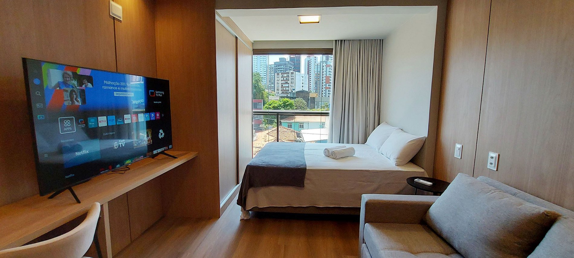 A solo 5 minutos del shopping Barra y del circuito de Carnaval Barra-Ondina. Con cama matrimonial y sofá cama matrimonial, smart TV, WI-FI, aire acondicionado split. Terraza con piscina y gimnasio. Edificio con garaje rotativo, recepción 24h, sala de juegos, coworking, sala de reuniones, minimercado y lavandería (pago aparte).