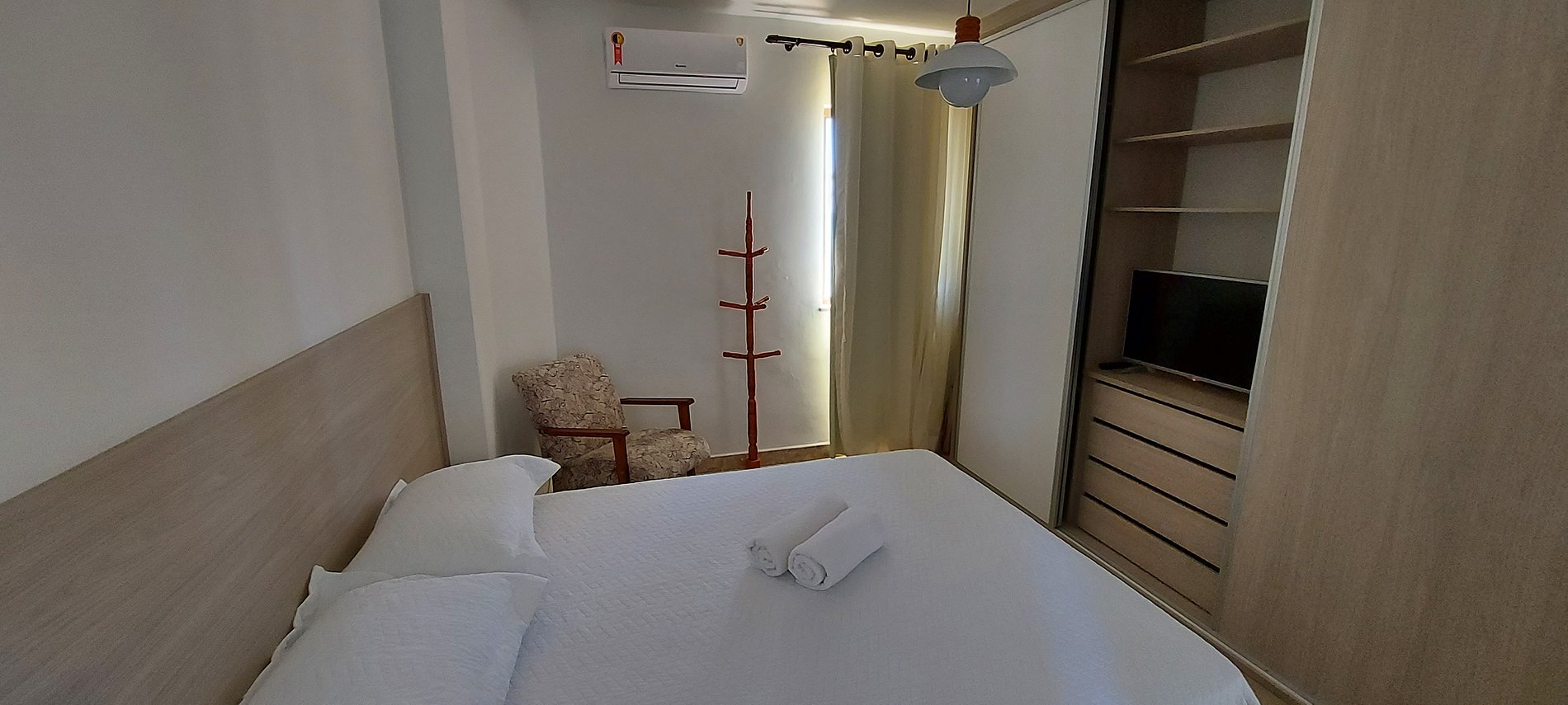 - Suite con cama doble, smart TV, sillón, 2 mesas esquineras, tendedero, armario, cortina black out, aire acondicionado split y baño con espejo y ducha eléctrica.