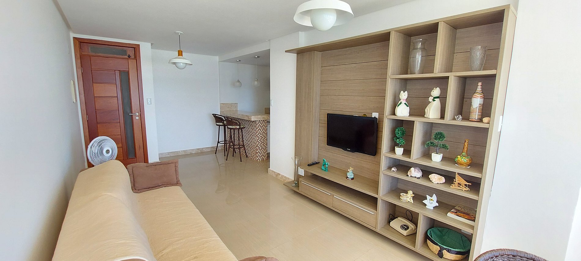 - Salón con amplio y cómodo sofá cama de 2 plazas, perchero de madera, TV con canales abiertos, WI-FI, ventilador de mesa, taburete, plancha, mesa de cristal con 4 sillas de mimbre, cortina fina