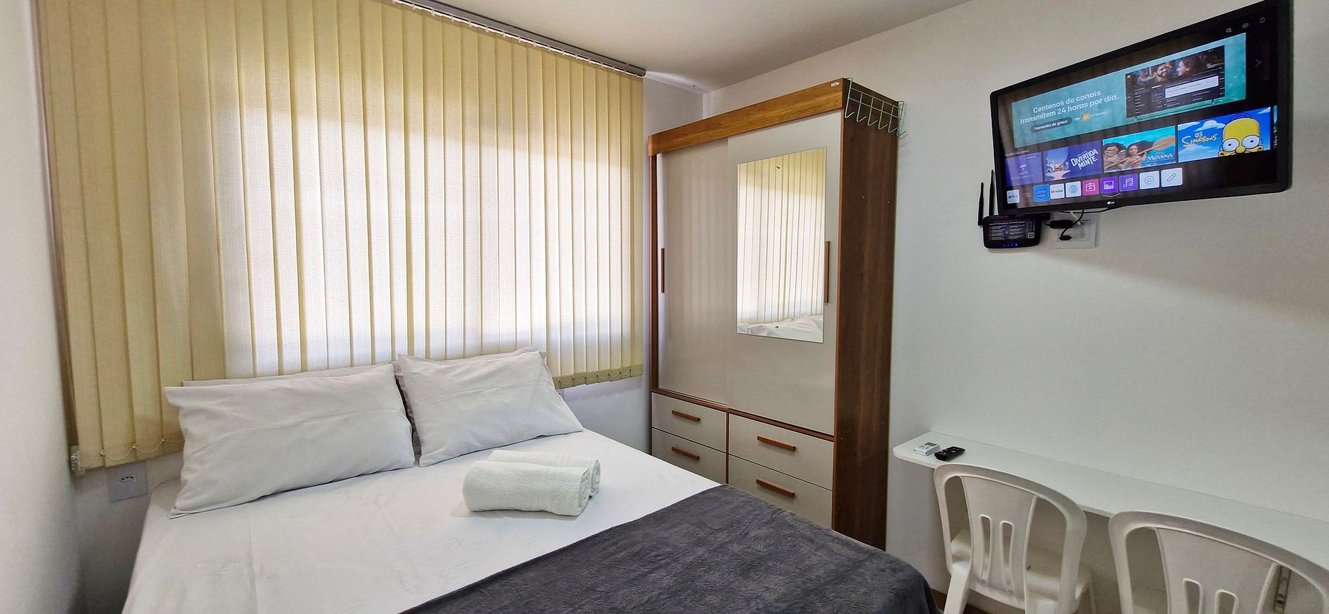 - Estudio de 15m² con cama doble, escritorio con 2 sillas, smart TV con apps y canales locales, WI-FI, aire acondicionado split, persianas enrollables, armario con espejo en la puerta