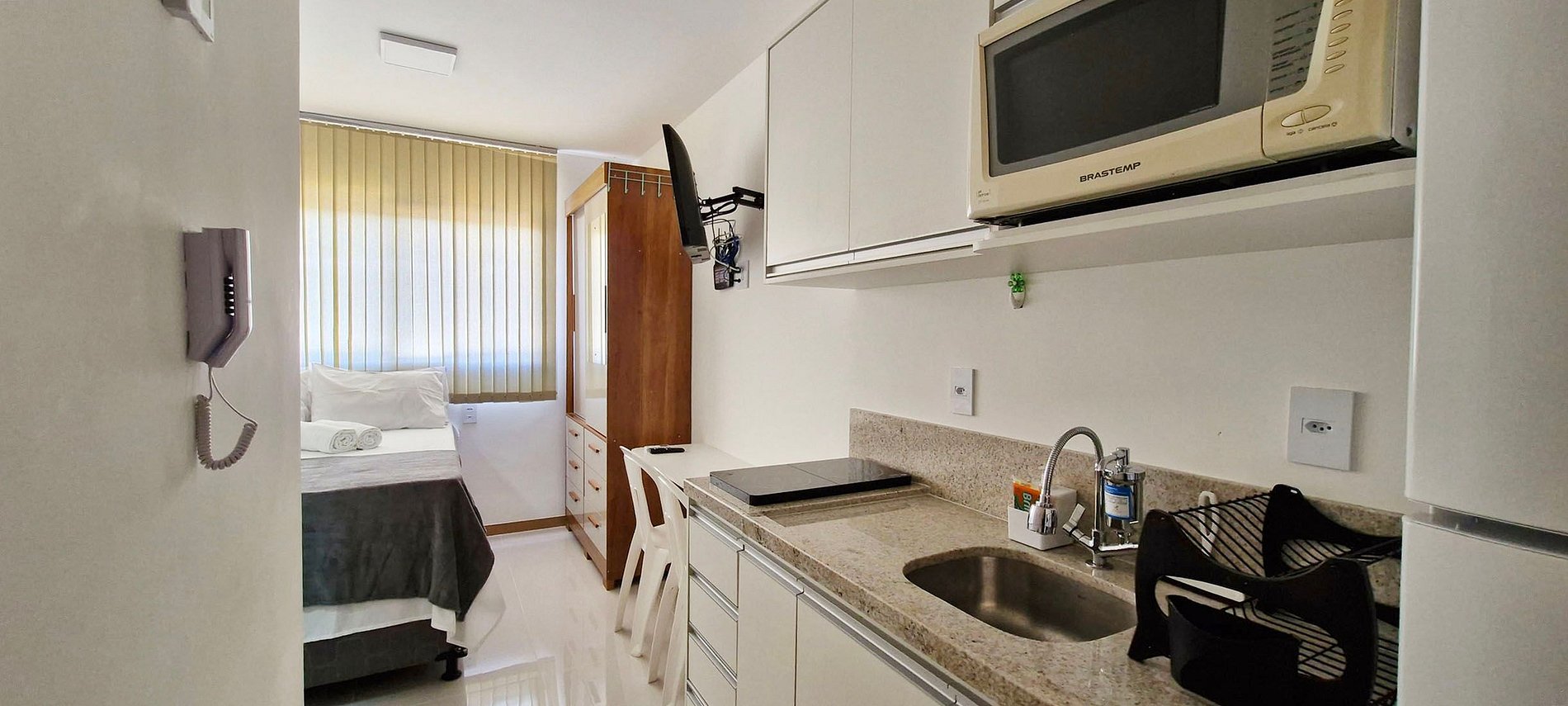 - Estudio de 15m² con cama doble, escritorio con 2 sillas, smart TV con apps y canales locales, WI-FI, aire acondicionado split, persianas enrollables, armario con espejo en la puerta