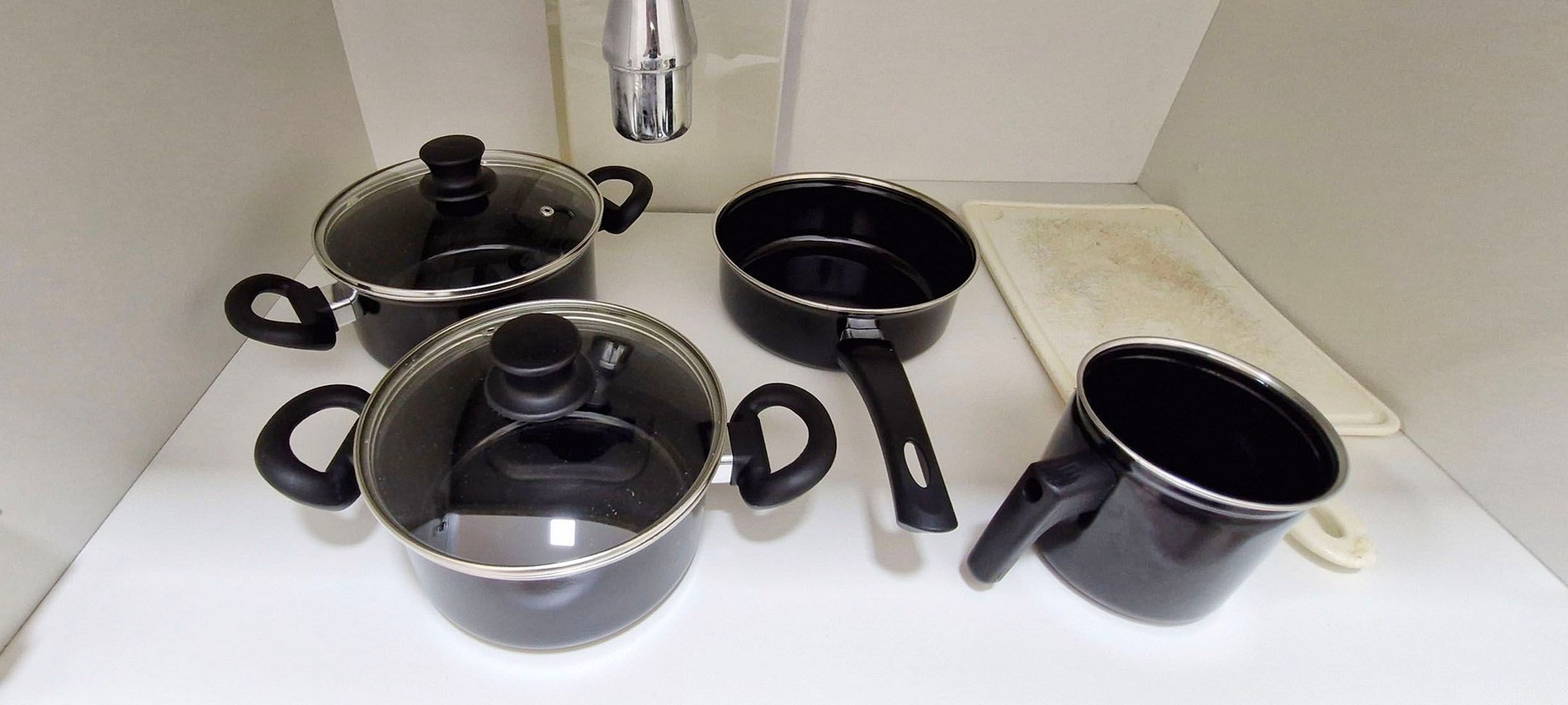 - Cocina con refrigerador duplex, microondas, placa de inducción de 2 fuegos, filtro de agua, cafetera eléctrica, sartenes, cubiertos, vasos, tazones, artículos básicos y accesorios de cocina.