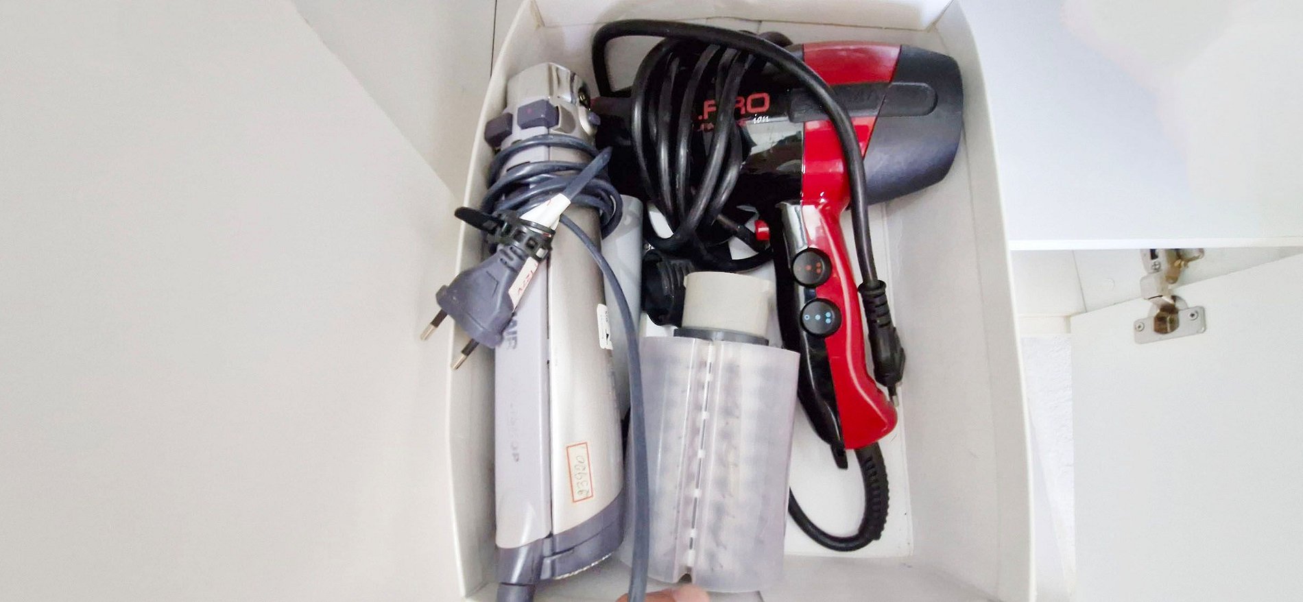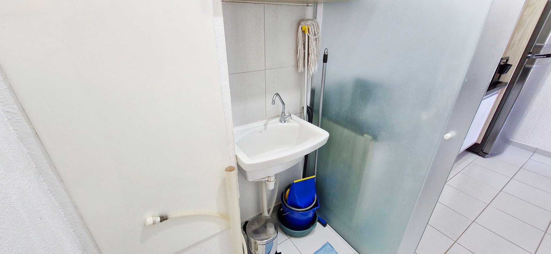 - Zona de servicio con fregadero, tendedero de techo, cubo, escoba, escobilla de goma y recogedor.