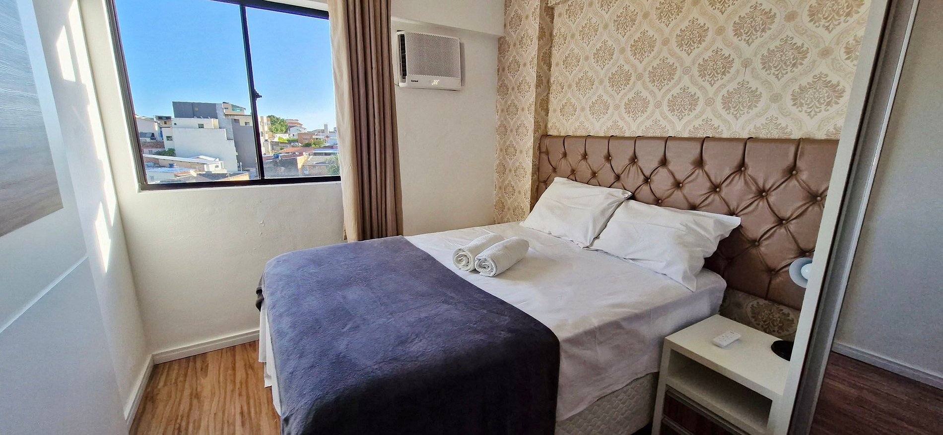 - Suite con cama doble, aire acondicionado de ventana, cortina blackout, armario con espejo, perchas, 2 mesitas de noche, 1 lámpara y baño con armario, espejo, box, ducha eléctrica, secador de pelo y cepillo giratorio.