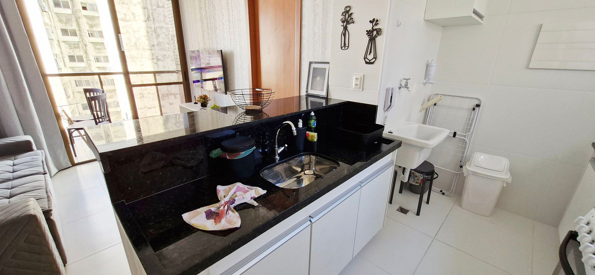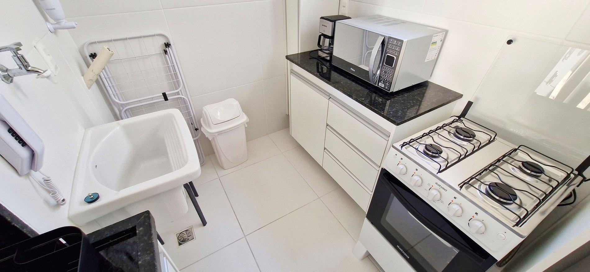 - COCINA: banca con 2 tronas, sandwichera, cafetera eléctrica, frigorífico duplex, microondas, termo, batidora, airfryer, cocina de 4 fuegos, sartenes, ollas, vasos, cuencos y accesorios diversos de cocina. Área de servicio con lavabo y tendedero de piso.