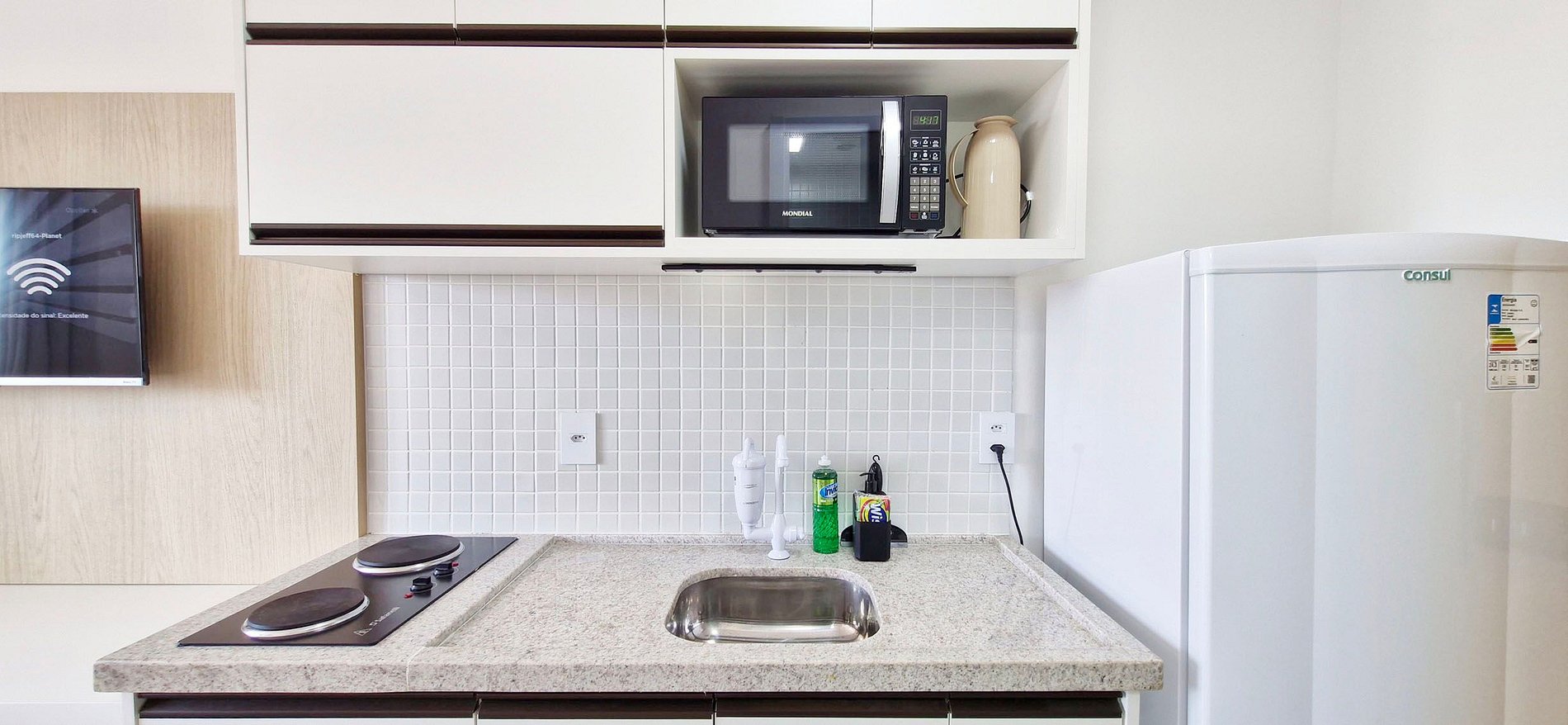 - Cocina completa con refrigerador, anafe eléctrico de 2 fuegos, filtro de agua, banca con silla, cafetera eléctrica, microondas, sandwichera, licuadora, termo y menaje básico de cocina.