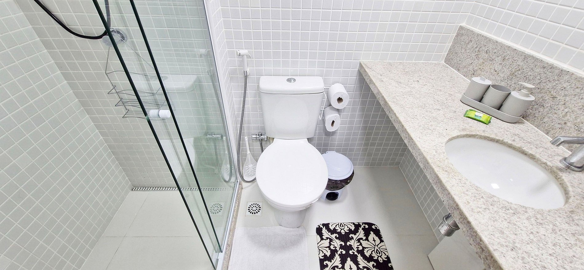 • No se pueden tirar residuos sólidos al inodoro (incluido el papel higiénico), le pedimos que utilice el contenedor de basura provisto. De lo contrario, el inodoro puede obstruirse y cobramos R$ 150 por desatascarlo.