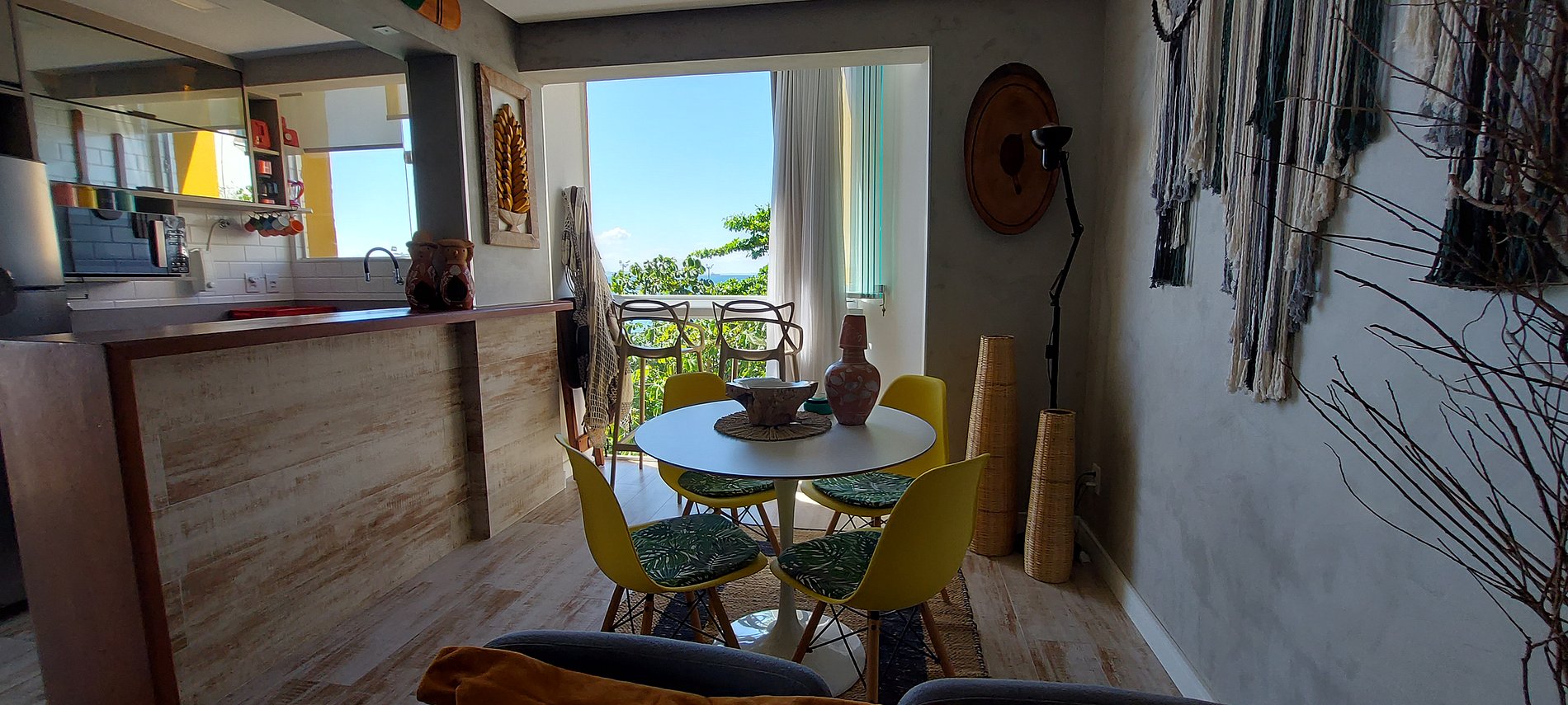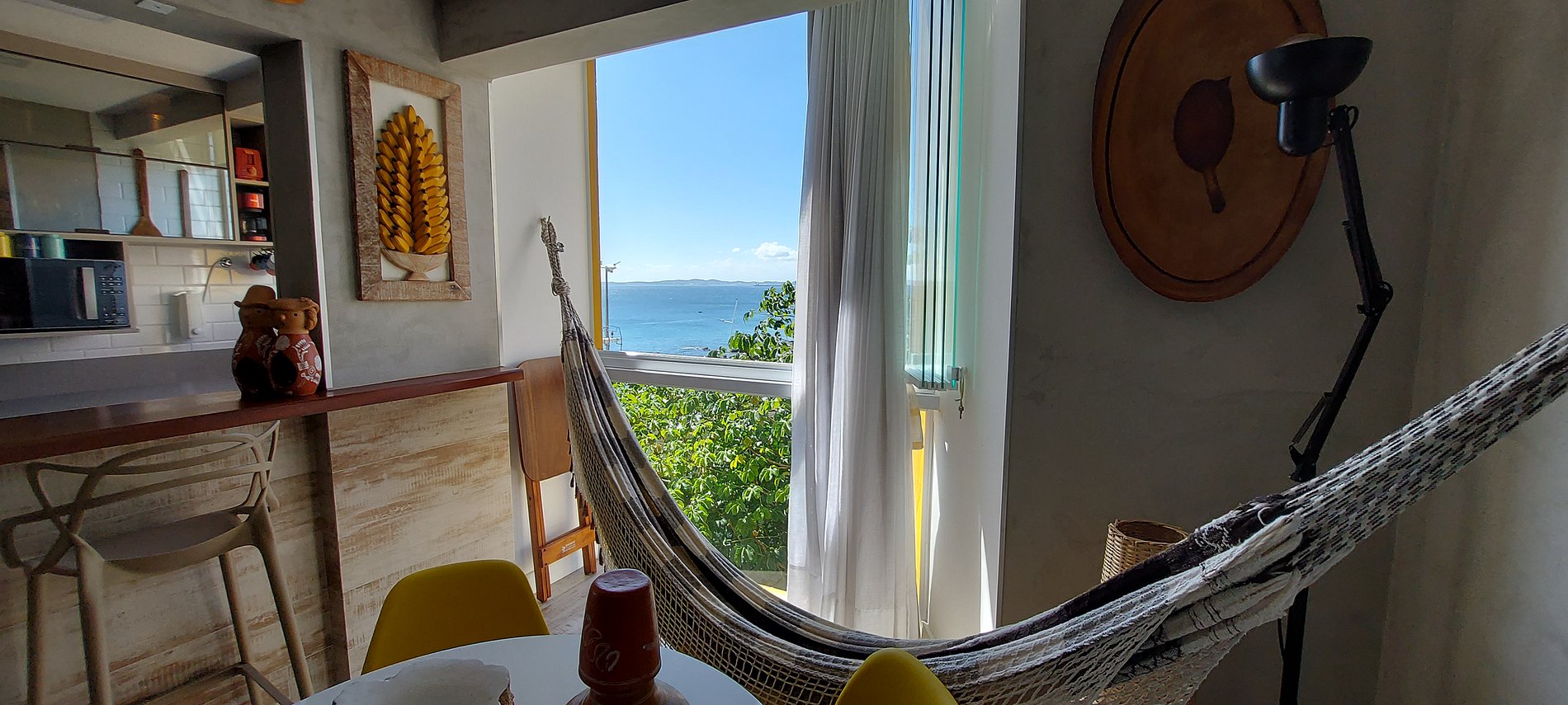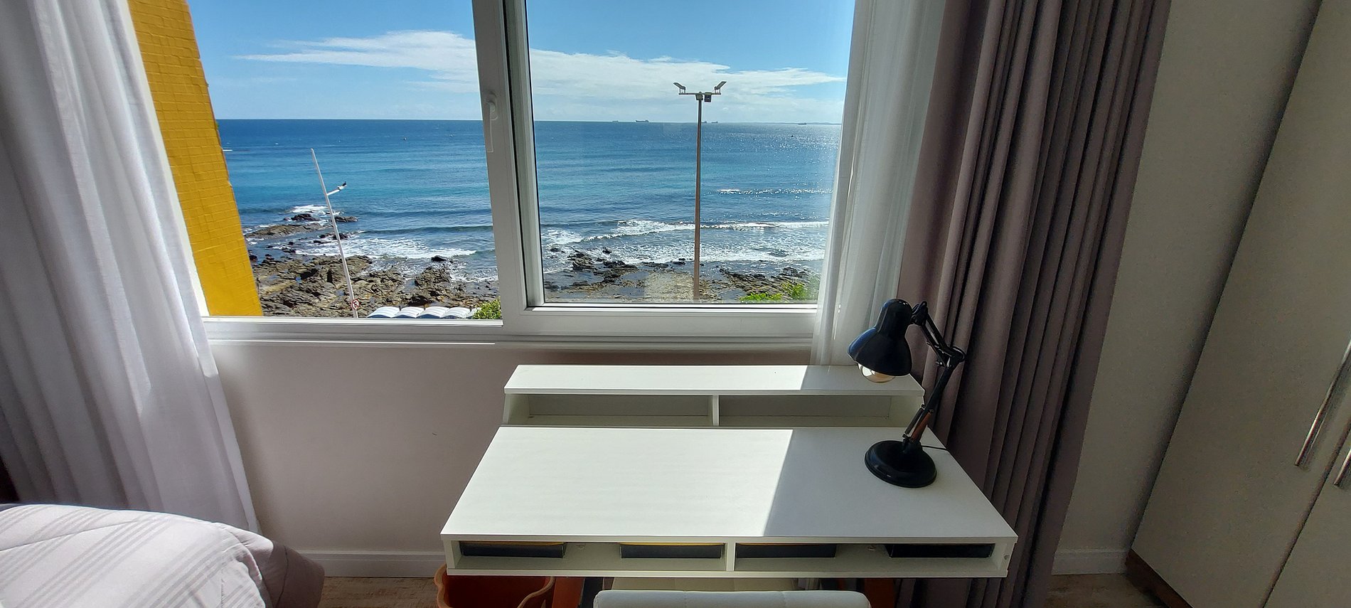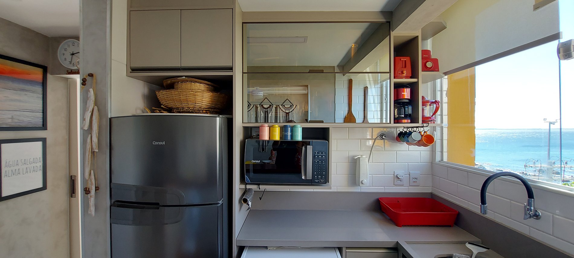 Dormitorio y sala de estar finamente decorados con una fantástica vista al mar de la playa de Barra. ¡Cerca del Farol da Barra! Con cama queen, smart TV en sala y dormitorio, aire acondicionado split, sala y comedor con ventiladores de techo, cocina completa, lavadora, baño cómodo. Espacio para trabajo home office frente al mar e internet 50MB. Un lugar inolvidable!