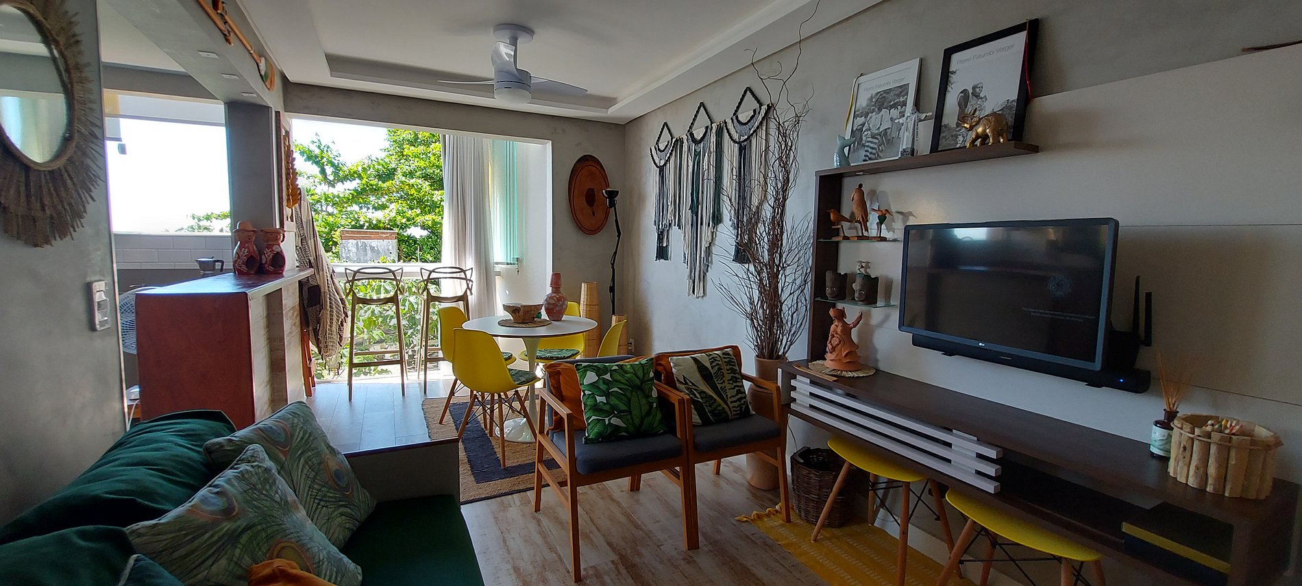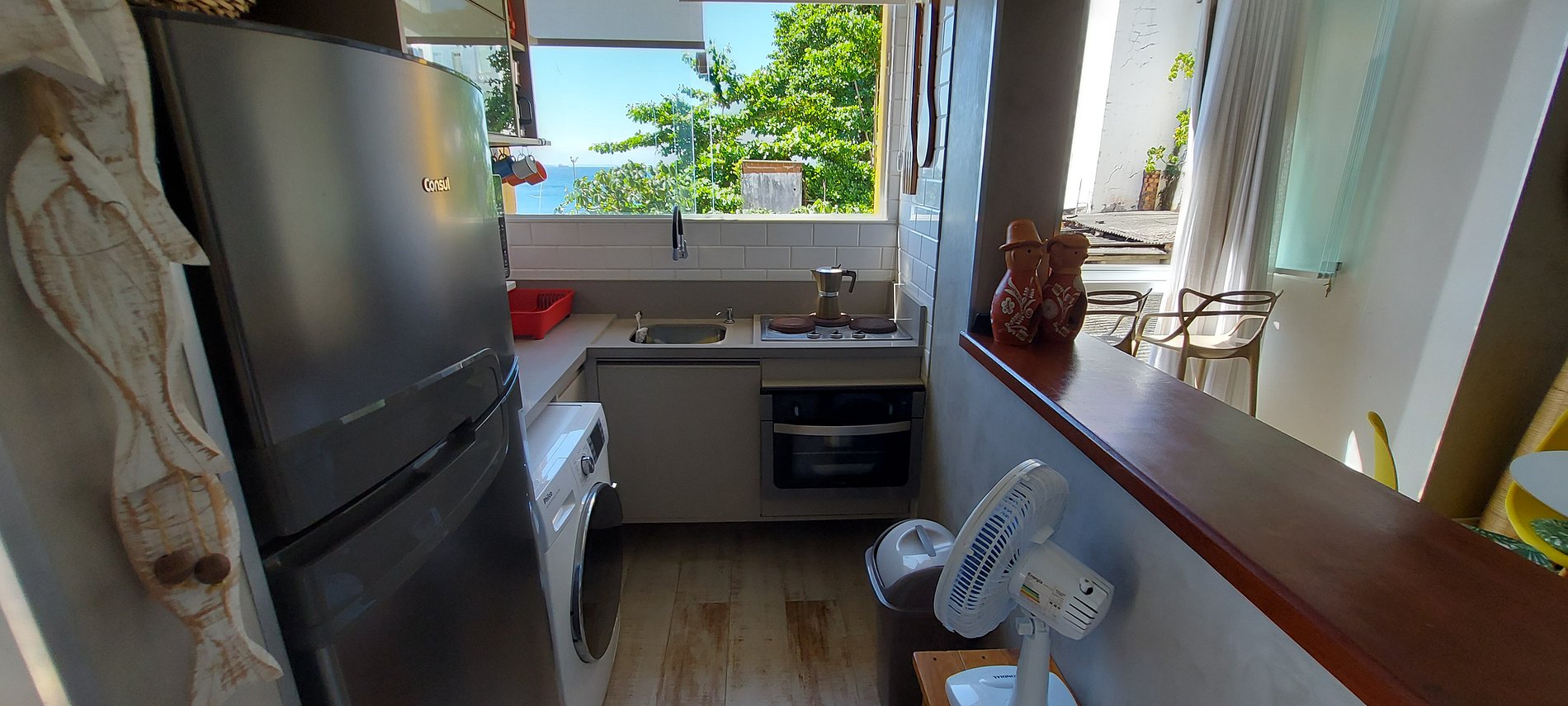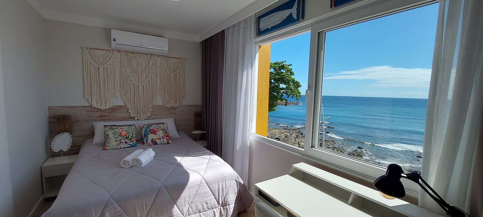 Dormitorio y sala de estar finamente decorados con una fantástica vista al mar de la playa de Barra. ¡Cerca del Farol da Barra! Con cama queen, smart TV en sala y dormitorio, aire acondicionado split, sala y comedor con ventiladores de techo, cocina completa, lavadora, baño cómodo. Espacio para trabajo home office frente al mar e internet 50MB. Un lugar inolvidable!