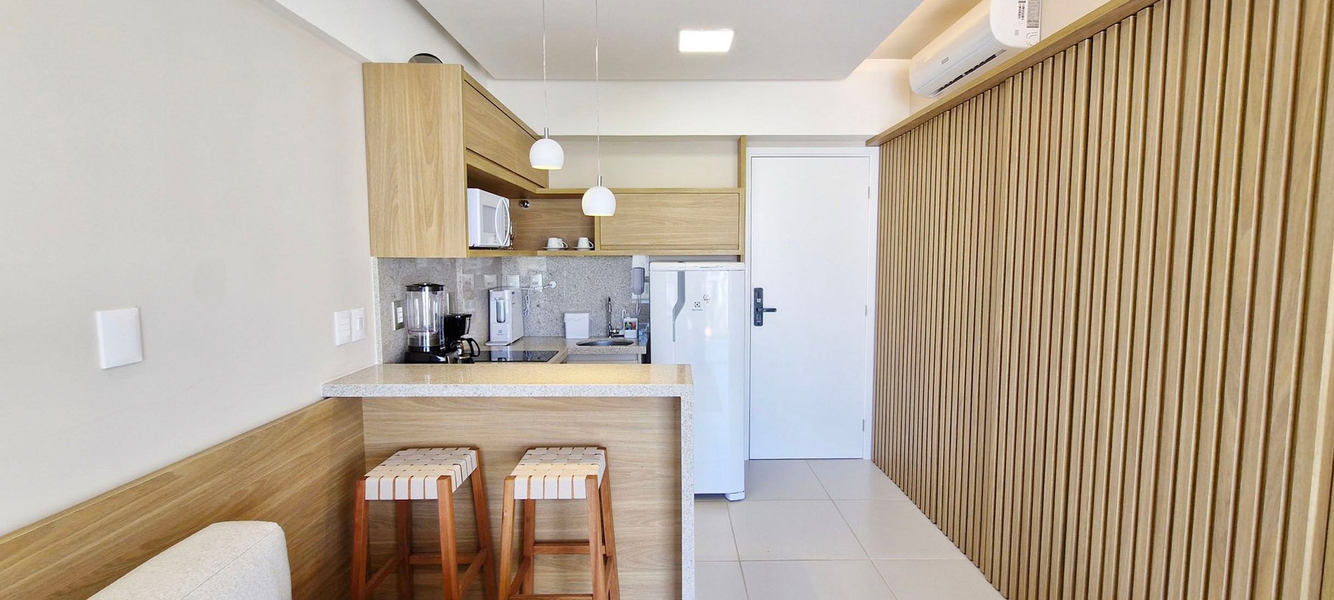 Aire acondicionado split en salón y dormitorio. Suite con cama casal, amplio balcón, salón con sofá cama doble, smart TV, WI-FI, cocina. Edificio con piscina y gimnasio en la azotea. Dispone de garaje rotatorio, lavandería (se paga directamente en la app) y recepción 24h