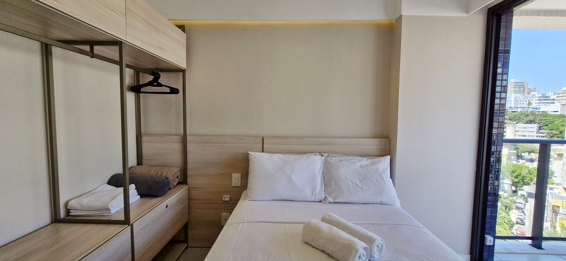 - SUITE: aire acondicionado split, cama casal (1m38cm x 1m88cm), armario, cortina blackout, puerta corrediza de vidrio con acceso al balcón, baño con closet, espejo, ducha, bidet y ducha eléctrica.