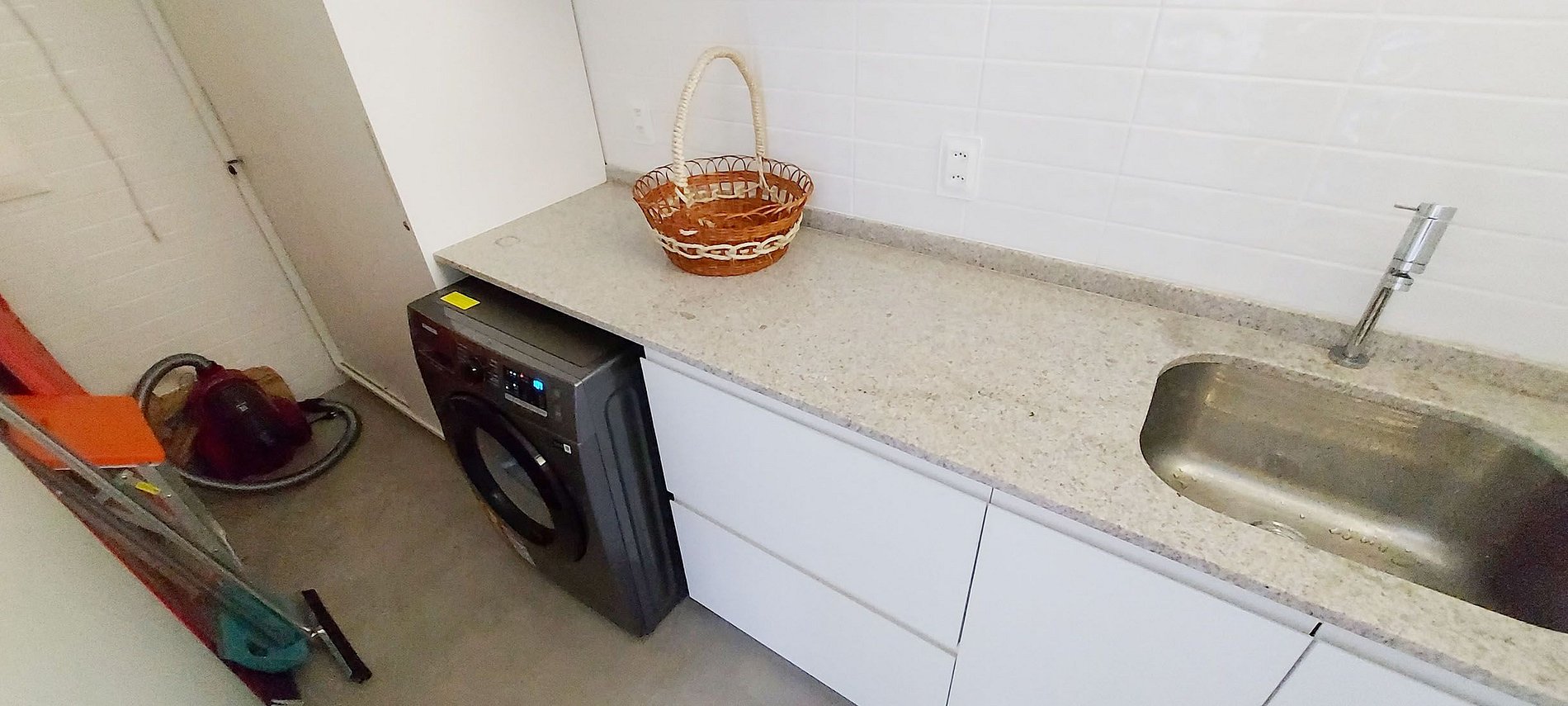 - Zona de servicio con fregadero, lavadora, armarios, aspirador, tendedero de colgar y tendedero de pie, tabla de planchar,