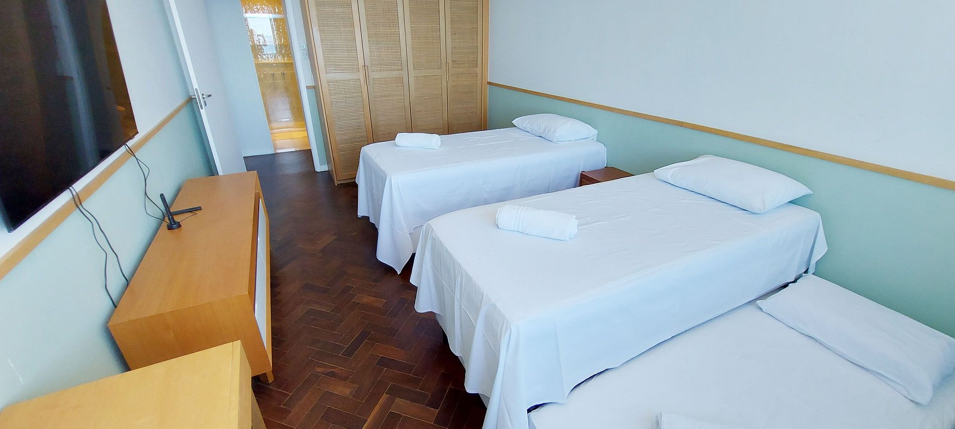 - DORMITORIO 1 - VISTA AL MAR - 1 cama doble, 2 literas individuales, armario, estante de madera, smart TV con canales locales, 1 mesita de noche, 1 mesa de madera con cajones, cortina opaca, aire acondicionado split