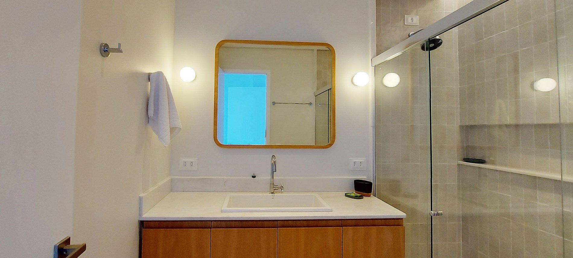 - Baño social: lavabo con espejo, closet, regadera, regadera eléctrica.