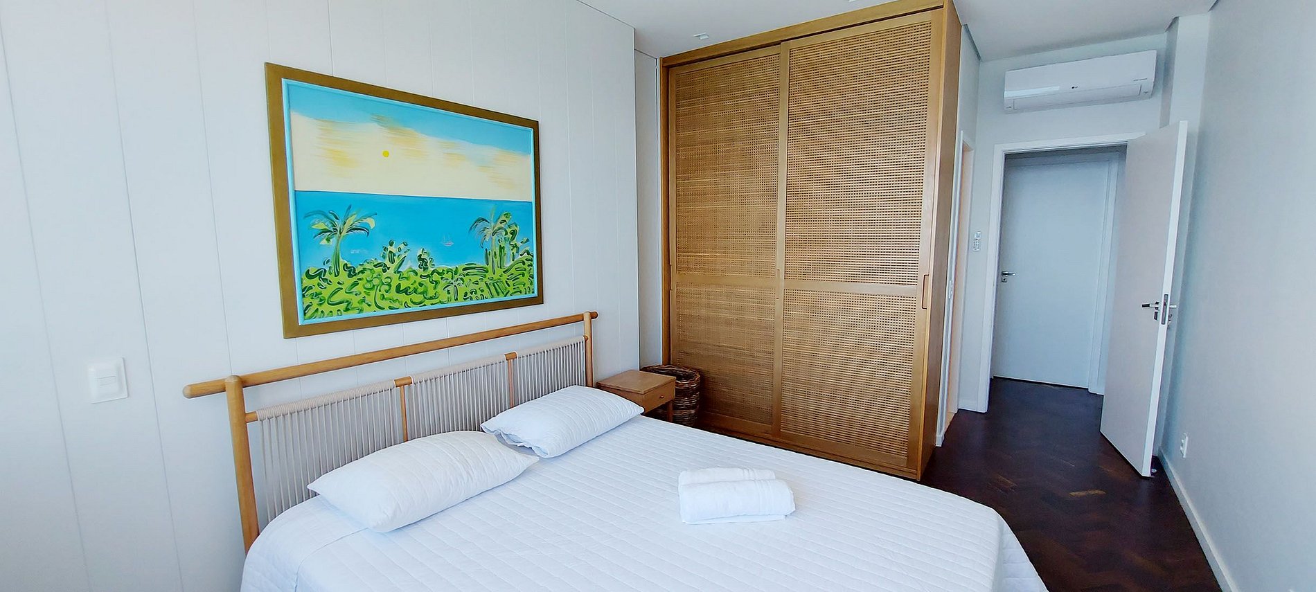 - DORMITORIO 1 - VISTA AL MAR - 1 cama doble, 2 literas individuales, armario, estante de madera, smart TV con canales locales, 1 mesita de noche, 1 mesa de madera con cajones, cortina opaca, aire acondicionado split